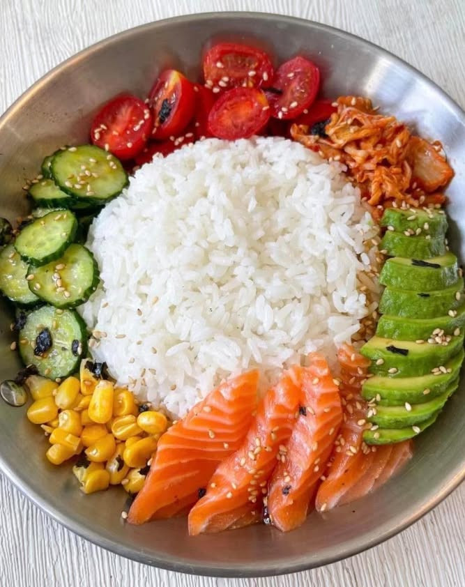 Cơm cá hồi ngâm nước tương Chuẩn bị nguyên liệu : - Phi lê cá hồi sống 300 gr - Nước tương 150 ml - Đường 2 muỗng canh - Hành tây 1 củ - Gừng 1 nhánh - Chanh 1 trái - Tiêu sọ 10 gr - Tỏi 2 củ - Hành tím 5 củ - Ớt xiêm xanh đỏ 6 trái - Ớt sừng loại không cay 5 trái - Nước lọc 70 ml Cách Chế biến : 1 . Phi lê cá hồi rửa sạch, lọc bỏ da rồi cắt thành từng miếng nhỏ vừa ăn, để ráo. - Cho vào nồi cỡ nhỏ 150ml nước tương , 70ml nước lọc, 2 muỗng canh đường, bắc nồi lên bếp, bật lửa nhỏ, vừa đun vừa khuấy đến khi đường tan hết thì tắt bếp, để nguội. - Hành tây lột vỏ, rửa qua với nước rồi cắt múi cau. Tỏi và hành tím lột vỏ, rửa sạch và cắt lát. - Gừng cạo sạch vỏ, rửa cho sạch rồi cắt sợi. 2 . Chuẩn bị hộp thủy tinh có nắp, xếp đều hành tây cắt múi cau, gừng cắt sợi, hành tím và tỏi cắt lát dưới đáy khuôn rồi xếp các miếng cá hồi lên trên. - Tiếp đến rưới nước tương để nguội và 150ml r.ượu trắng vào, xếp 6 trái ớt xiêm xanh đỏ, 5 trái ớt sừng loại không cay, rắc 10gr tiêu sọ lên trên cùng, đậy nắp hộp rồi cất vào ngăn mát tủ lạnh 8 tiếng là có thể lấy ra sử dụng . 3 . Xếp cá hồi ra đĩa , thêm cơm , kim chi , bắp hạt , bơ và dưa leo