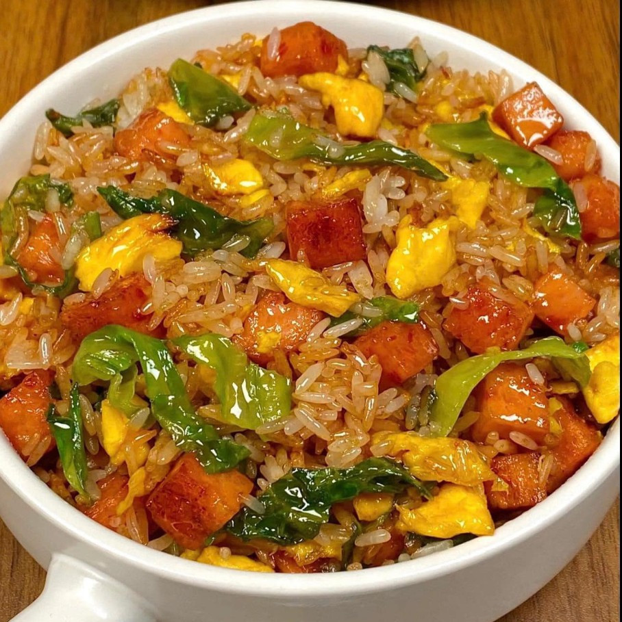* Chuẩn bị nguyên liệu - Cơm nguội, trứng, thịt hộp, rau - Gia vị: mắm, dầu hào, muối, bột thì là * Cách chế biến 1. Đập trứng ra bát, khuấy đều lên rồi cho vào xào. Xào xong thì cho trứng ra đĩa để lát dùng sau 2. Thịt hộp thái hạt lựu rồi cho vào chiên xém vàng hai mặt, sau đó đổ trứng và cơm nguội vào, nêm thêm 1 thìa nước mắm, 1 thìa dầu hào, một chút muối và bột thì là, đảo đều lên để cơm và trứng ngấm đều gia vị 3. Cuối cùng là cho thêm loại rau mà bạn thích ăn vào, đảo cho rau chín nữa là xong rồi Nguồn sưu tầm