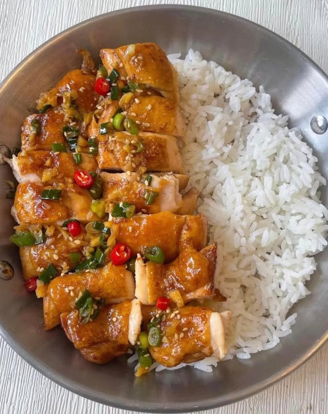 Cơm gà sốt hành gừng Chuẩn bị nguyên liệu : - Đùi gà - Hành lá , gừng , tỏi , ớt , mè rang Cách Chế biến : 1 . Ướp đùi gà với 1 thìa nước tương , 1 thìa hắc xì dầu , 1 thìa r.ượu nấu ăn và 1 ít tiêu đen trong 20 phút , sau đó cho lên chảo chiên đến khi chín vàng thì lấy ra , cắt miếng vừa ăn . 2 . Pha nước sốt : Cho hành lá , tỏi băm , gừng , mè rang vào bát , thêm 1 thìa dầu nóng . Khuấy đều . Cho tiếp 3 thìa nước tương , 1 thìa đường và giấm vào rồi trộn đều hỗn hợp . 3 . Cho gà ra đĩa , thêm cơm rồi rưới nước sốt vừa pha lên gà