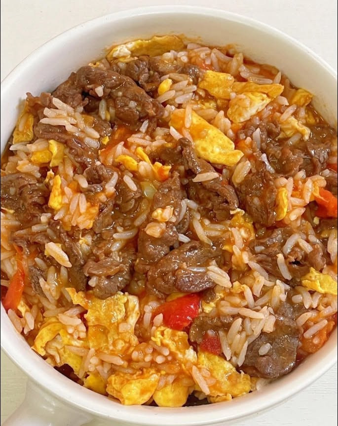 Cơm trộn sốt cà chua * Chuẩn bị nguyên liệu: - Cơm, thịt bò, trứng, cà chua - Gia vị: mắm, dầu hào, hạt tiêu xay * Cách chế biến: 1. Đập trứng gà ra bát, khuấy đều rồi cho vào chảo chiên chín rồi đổ trứng ra bát 2. Thịt bò ướp cùng 1 thìa nước mắm, 1 thìa dầu hào, một chút hạt tiêu, một chút dầu rồi cho vào chảo xào. Thị bò thì mình sẽ chỉ xào tái thôi rồi cho ra bát 3. Vẫn dung chảo đó, cho cà chua vào xào mềm, bạn có thể cho thêm một xíu xíu nước để cà chua nhanh nhừ hơn. Khi cà chua đã mềm thì cho trứng và thịt bò vào, đảo đều tay rồi đổ cơm vào, nêm thêm mắm cho vừa khẩu vị rồi đảo đều lại là xong Ẩn bớt
