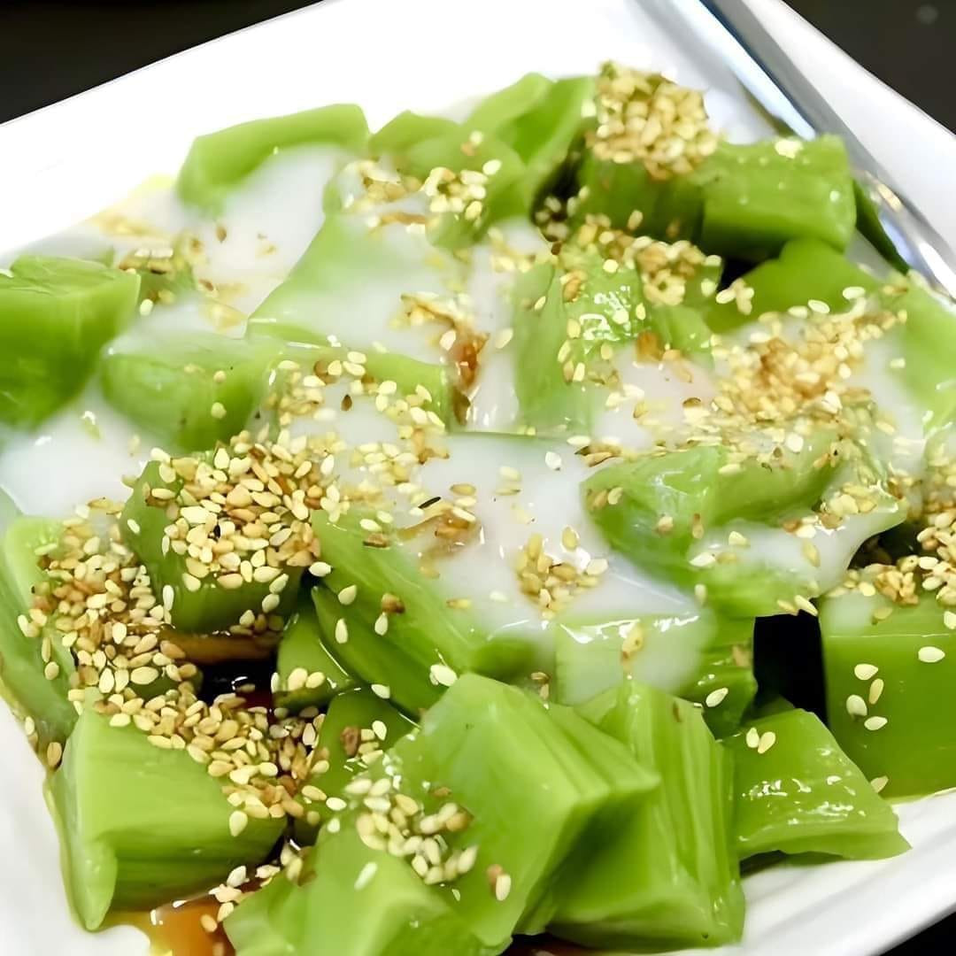 Công Thức Làm Bánh Đúc Gân Lá Dứa Siêu Ngon Tại Nhà Nguyên liệu: 120g bột năng 80g bột gạo 1 muỗng cà phê tinh bột bắp 300ml nước cốt dừa Thái 250g đường thốt nốt 10g gừng cắt lát 6 lá dứa Một ít mè rang Một ít đường/muối Cách làm: Rửa sạch 5 lá dứa, xay nhuyễn cùng 150ml nước, lọc qua rây lấy 150ml nước cốt lá dứa. Trộn 60g bột năng, 40g bột gạo, 1/4 muỗng cà phê muối, 2 muỗng cà phê đường và 150ml nước cốt lá dứa trong một tô, khuấy đều cho bột tan. Trong một tô khác, trộn 60g bột năng, 40g bột gạo, 1/4 muỗng cà phê muối, 2 muỗng cà phê đường, 100ml nước cốt dừa và 50ml nước lọc, khuấy đều. Để yên 2 tô bột khoảng 30 phút cho bột nghỉ. Đun sôi 150ml nước trong nồi, hạ lửa nhỏ và từ từ đổ hỗn hợp bột cốt dừa vào, khuấy đều đến khi bột hơi sánh lại. Nhấc nồi ra khỏi bếp và tiếp tục khuấy cho bột sệt đặc lại. Đun sôi 150ml nước trong nồi mới, làm tương tự với phần bột lá dứa. Chuẩn bị khuôn silicon lớn, đổ phần bột lá dứa vào khuôn, sau đó đổ chồng phần bột cốt dừa lên trên. Dùng muỗng trộn nhẹ nhàng để tạo đường vân trắng xanh đẹp mắt. Đặt khuôn bánh vào xửng hấp, đậy nắp kín và hấp chín bánh từ 15 - 17 phút kể từ lúc nước bắt đầu sôi. Để bánh nguội hoàn toàn và cho vào ngăn mát tủ lạnh từ 4 - 12 tiếng để bánh định hình và đạt độ dẻo giòn. Đun 250g đường thốt nốt, 250ml nước và 10g gừng cắt lát trong nồi trên lửa trung bình từ 10 - 13 phút đến khi đường tan hết. Thêm 2 lá dứa nhỏ và nấu thêm 1 phút nữa rồi tắt bếp. Đun 200ml nước cốt dừa, 1/4 muỗng cà phê muối, 2/3 muỗng canh đường và 1 muỗng cà phê tinh bột bắp trong nồi trên lửa trung bình cho sôi. Khi nước cốt dừa sôi, hạ lửa nhỏ và khuấy thêm 1 phút nữa rồi tắt bếp. Lấy bánh đúc ra khỏi khuôn, cắt miếng vừa ăn, cho vào dĩa và rưới thêm nước cốt dừa, nước đường lên trên. Chúc bạn thành công với món bánh đúc gân lá dứa này nhé! Nếu bạn có bất kỳ câu hỏi nào khác, đừng ngần ngại hỏi nhé!