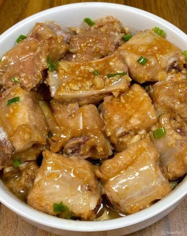 CÔNG THỨC LÀM SƯỜN NON HẤP TỎI THƠM NGON , LẠ MIỆNG 🤩 Chuẩn bị nguyên liệu : - 500g sườn non - Tỏi - Bột bắp - Gia vị : Nước tương , dầu hào , hạt nêm , muối , đường . Cách Chế biến : 1 . Sườn heo cắt miếng vừa ăn , ngâm với nước giấm loãng trong 10 phút rồi rửa lại bằng nước cho sạch , để ráo . 2 . Đun nóng dầu cho tỏi băm vào phi thơm . - Pha nước sốt tỏi theo tỉ lệ : 3 thìa dầu tỏi băm , 2 thìa nước tương , 1 thìa dầu hào , 1 thìa đường , 1 ít hạt nêm , muối . Khuấy đều hỗn hợp . 3 . Đổ hỗn hợp sốt tỏi vào sườn non . Thêm 1 thìa bột bắp rồi trộn đều , dùng màng thực phẩm bọc lại ướp trong 20-30 phút . 4 . Sau đó cho sườn vào nồi hấp trong 20-25 phút là xong . Cuối cùng lấy ra rắc hành lá lên , dọn ra đĩa thưởng thức cùng cơm nóng . Chúc các bạn thành công với công thức này nhé .
