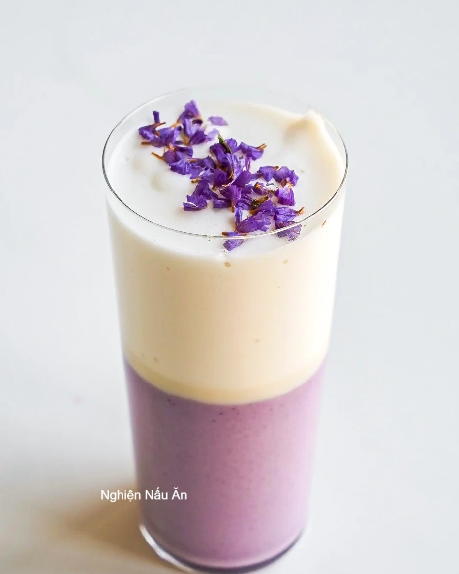 CÔNG THỨC PHA SỮA ĐẬU VỚI KHOAI LANG TÍM " KHOAI MÔN" CỤC KỲ ĐƠN GIẢN DỄ LÀM. Cách làm chi tiết Làm phần sữa khoai môn khoai lang tím Xay thật mịn hỗn hợp gồm: - Khoai môn hấp chín - Sữa đặc - Kem tươi - Sữa tươi - Bột khoai lang tím Hỗn hợp sẽ sánh, mịn và có màu tím rất đẹp. Tạo bọt sữa đậu nành - Đun nóng sữa đậu nành. - Đánh bông nhẹ để tạo lớp foam mềm mịn. Phối hai lớp đồ uống - Đổ nửa ly hỗn hợp khoai môn khoai lang tím vào đáy ly. - Rót nửa ly sữa đậu nành nóng lên trên. Hai lớp hòa vào nhau tạo màu tím trắng rất đẹp mắt. Trang trí - Rắc một chút bột khoai lang tím lên mặt ly cho thơm và lên màu. - Trang trí bằng lá phong tím hoặc vàng cho ly thêm tinh tế. Thành phẩm Ly sữa đậu niêm khoai môn khoai lang tím béo nhẹ, thơm bùi, màu sắc đẹp mắt. Món này uống nóng hay lạnh đều hợp, đặc biệt rất “ăn ảnh”. Chúc cả nhà thành công với cách làm trên, đừng quên chia sẻ công thức đến nhiều người biết đến hơn nhé cả nhà.
