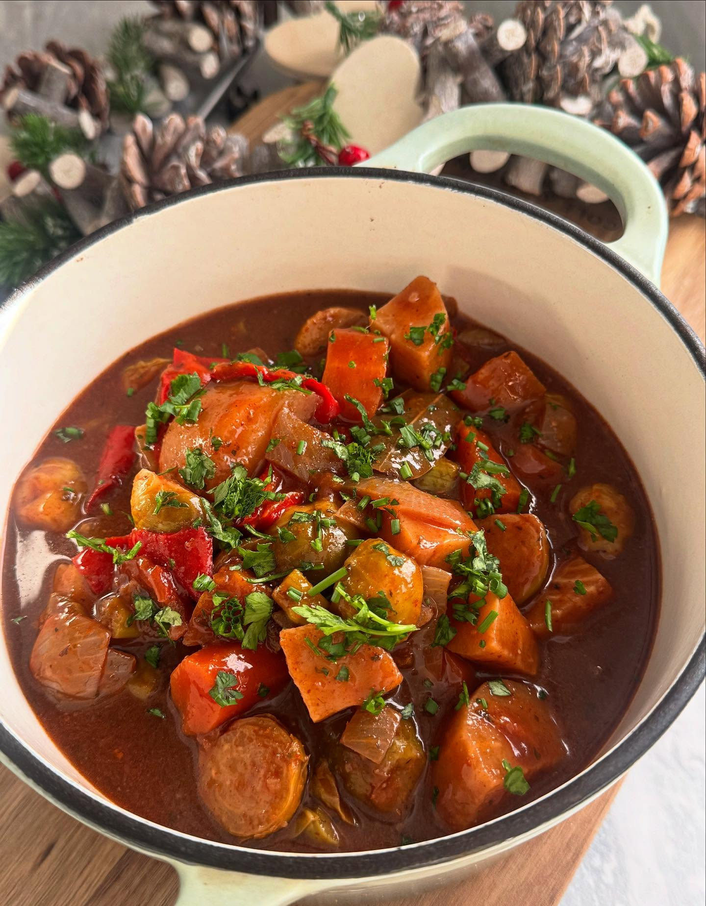 Ingredients: • 2 parsnips, peeled & chopped • 2 long pointed peppers, sliced • 1 bunch asparagus, chopped into 2–3cm pieces • 200g sprouts, halved • 2 carrots, chopped • 3 medium potatoes, chopped • 1 onion, chopped • 2 garlic cloves, minced • 1 tbsp olive oil • 1 tsp smoked paprika • 1 tsp dried thyme or rosemary • Salt & pepper • 1 tbsp tomato purée • 400ml red wine stock • 1 onion gravy pot or 1 tbsp onion gravy granules + 150ml water