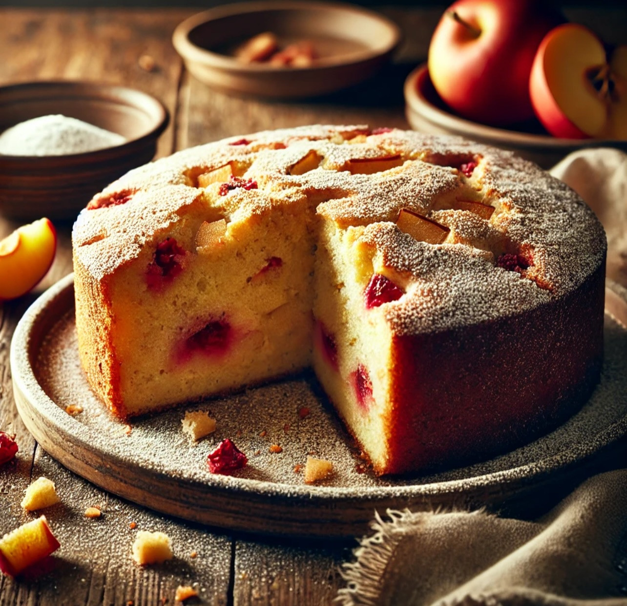 🔥 Instructions: 1. Preheat oven to 350°F / 175°C. Grease a loaf or round cake pan. 2. Mix wet ingredients: Whisk eggs, sugar, yogurt, oil, and vanilla until smooth. 3. Add dry ingredients: Sift in flour, baking powder, and salt. Stir until just combined. Gently fold in the chopped fruit. 4. Bake: Pour into the pan and bake for 40–50 minutes, or until golden with a cracked top and toothpick comes out clean. 5. Cool & dust: Let cool slightly. Slice rough. Dust with powdered sugar if you like. Serve with fingers or fork — it doesn’t matter.