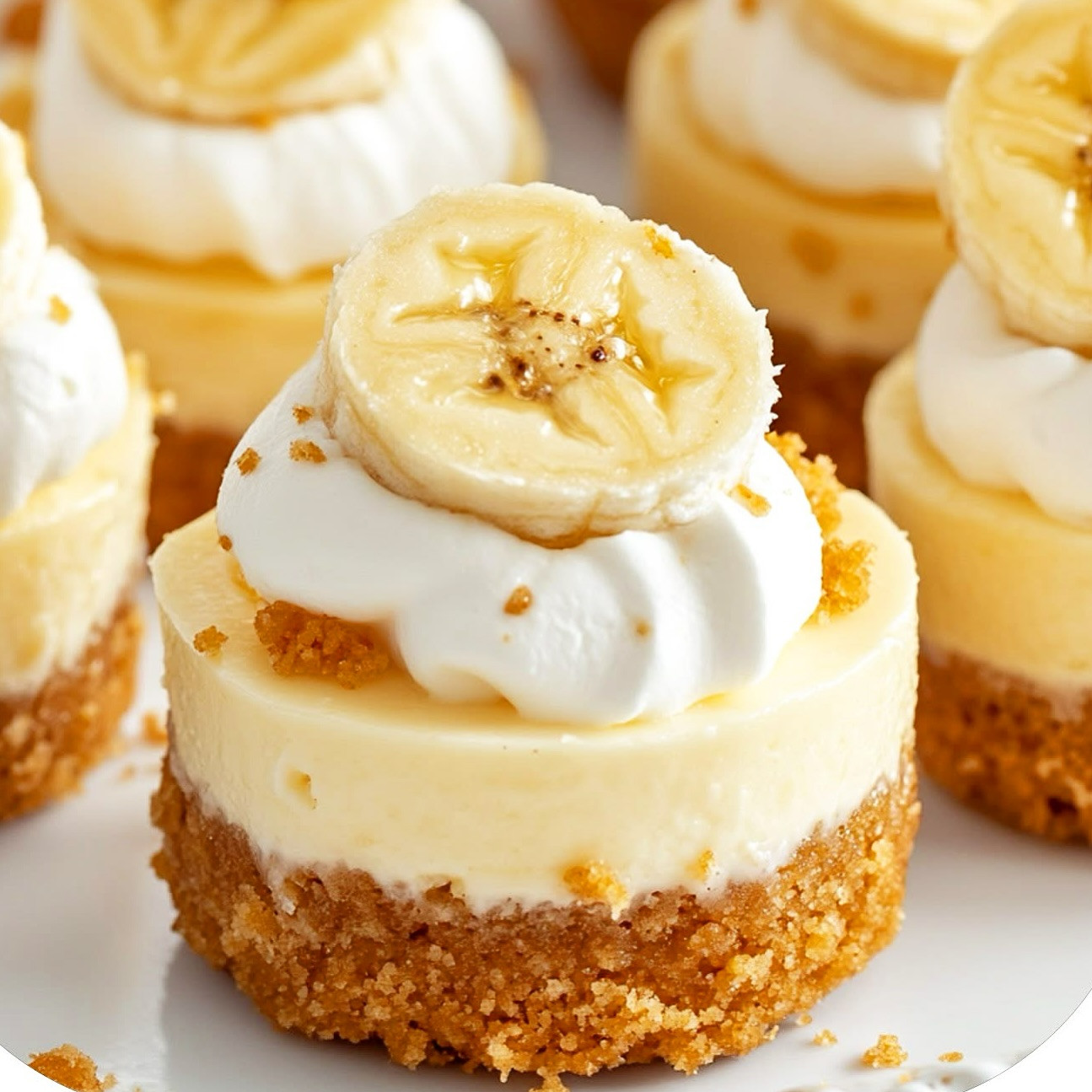 In a medium bowl, combine the crushed vanilla wafers and melted butter. Mix until the crumbs are fully coated and resemble wet sand. Spoon the mixture evenly into a 12-cup muffin tin lined with paper liners or silicone molds. Press down firmly to form a compact crust. Make the cheesecake filling: In a separate mixing bowl, beat the softened cream cheese until completely smooth and free of lumps. Add the sweetened condensed milk, mashed banana, and vanilla extract. Mix until the filling is creamy and well combined. Gently fold in the whipped topping until just incorporated.