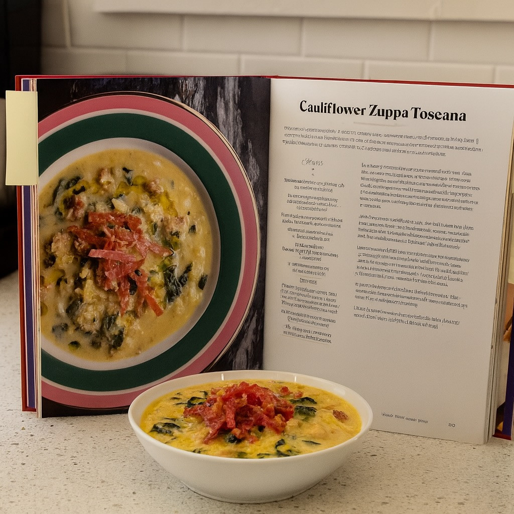 🥣 Cauliflower Zuppa Toscana Creamy, hearty, and full of comfort, yet completely dairy-free (you’d never guess!). A little Parm in the broth gives it richness, and the kale and sausage bring it home. Perfect for those evenings when you just want a bowl of something that hugs back.