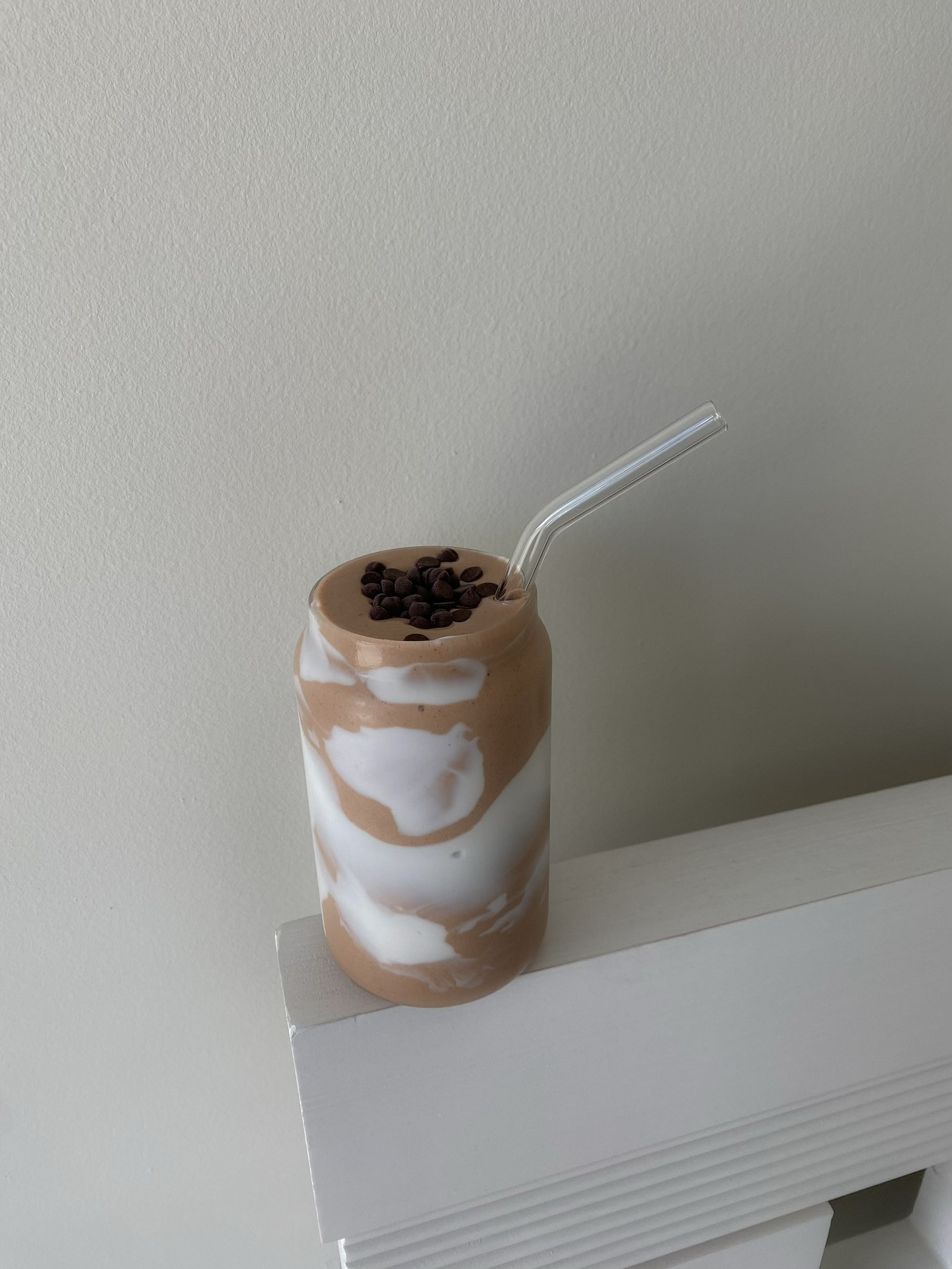 instructions: add all the ingredients to a blender and blend until smooth. only use half of the chobani greek yogurt in the smoothie and use the other half to put around the glass! topped with @enjoylifefoods chocolate chips
