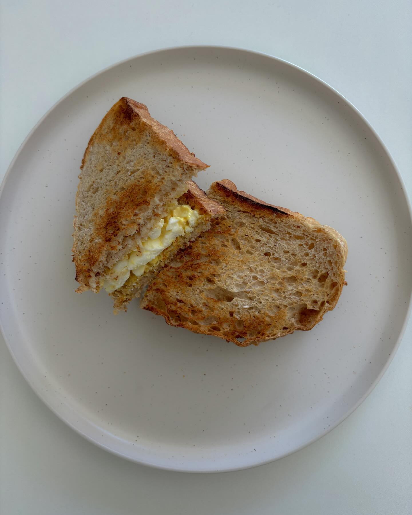 egg salad: 2 hard boiled eggs mayo mustard garlic powder salt pepper dash of paprika (optional but I like the spice it adds)
