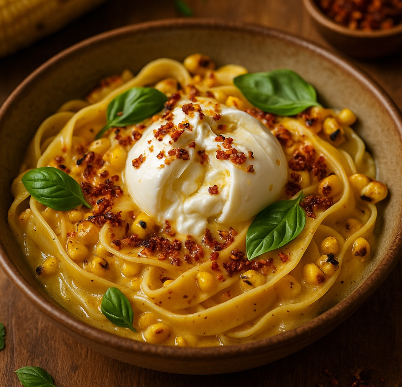 Quick Steps 1️⃣ Heat olive oil in a small skillet, add panko and chili flakes; toast 2 min until golden. Season with a pinch of salt and set aside. 2️⃣ Melt butter in a pan, add corn, miso, and cream; simmer 3 min, stirring. 3️⃣ Cook tagliatelle al dente, reserving ¼ cup pasta water. Toss pasta into the corn–miso sauce with Parmesan and the reserved water until glossy. Season with salt and pepper. 4️⃣ Twirl pasta into bowls, top with burrata, sprinkle chili-crunch crumbs, and garnish with basil. Crack the burrata open and enjoy!