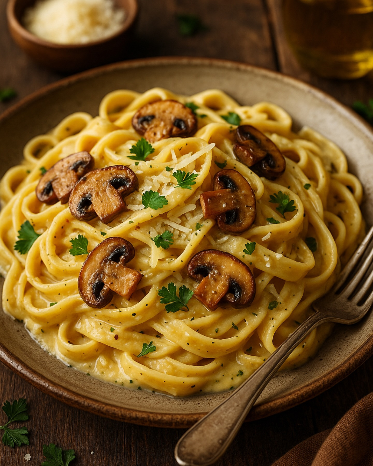 Luxuriously creamy and packed with sautéed mushrooms, this fettuccine Alfredo is comfort food at its finest — rich, savory, and full of flavor with every forkful.