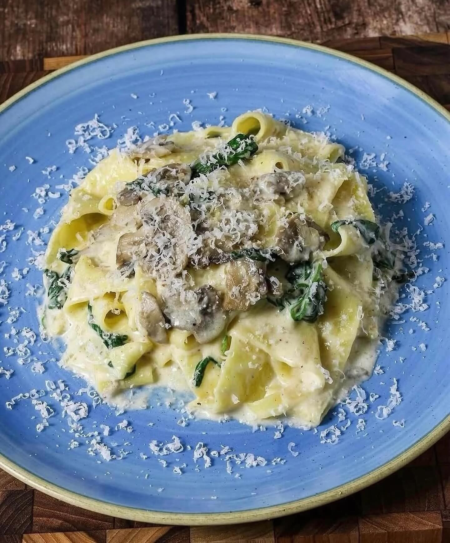 Pappardelle with spinach and mushrooms in a creamy parmigiano sauce 🍝