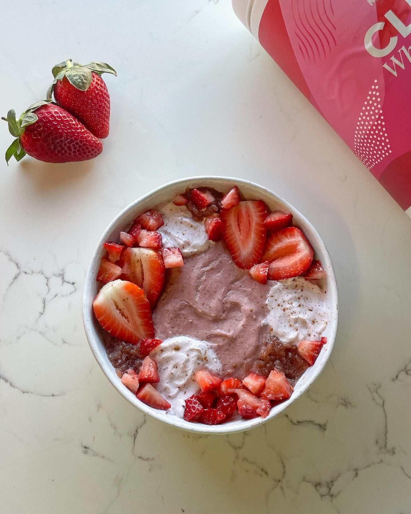 - 50g oats + 1c water - 1 scoop chupa chup clear whey @myproteinau (dc LILYC) - 1 tbsp strawberry yoghurt - handful of strawberries (for the pink colour)