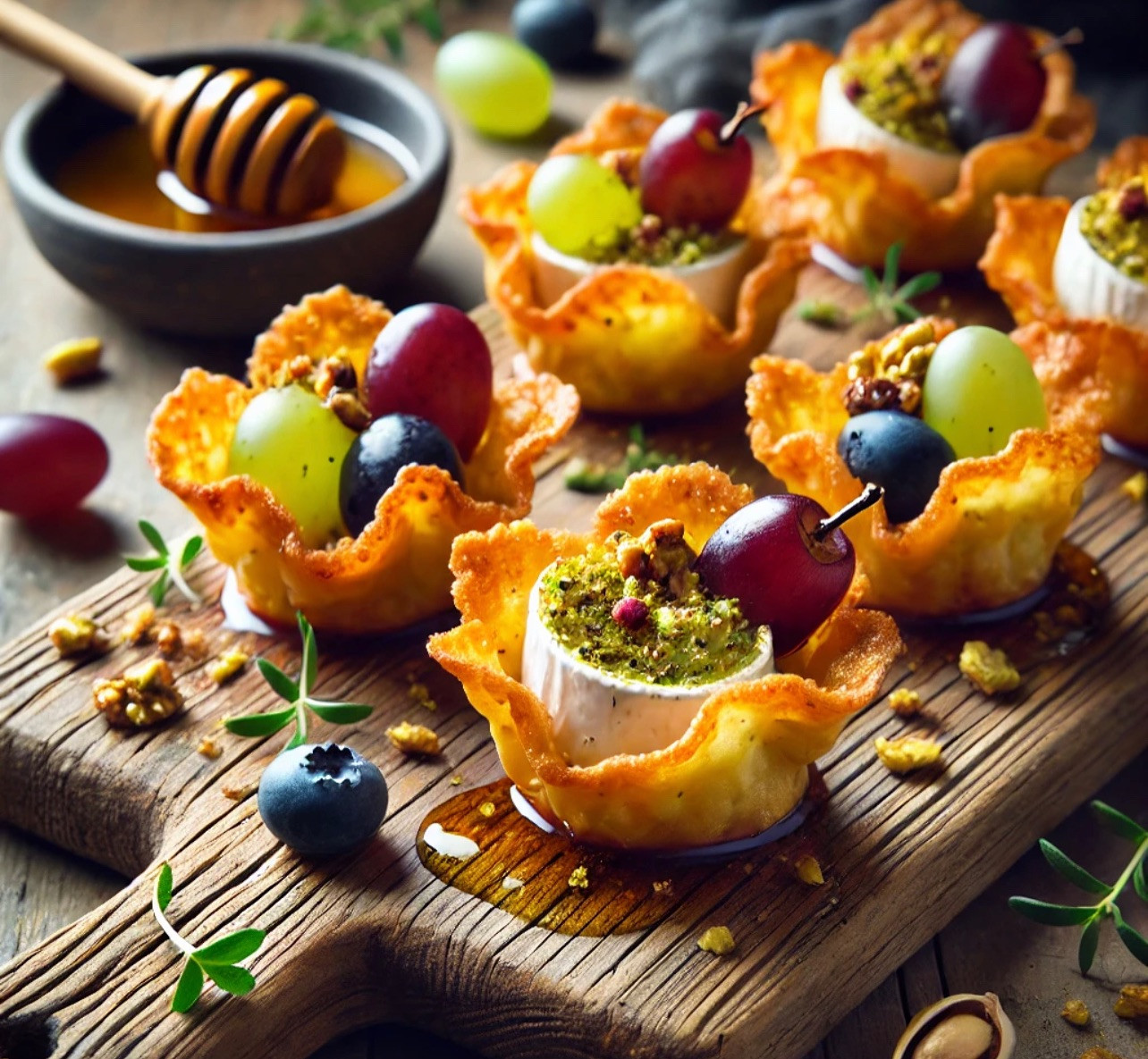• 8 wonton wrappers • 100g (3.5 oz) brie cheese, cubed • ½ cup seedless red grapes, roasted • 2 tbsp crushed pistachios • 1 tbsp honey (for drizzling) • Fresh thyme or rosemary for garnish