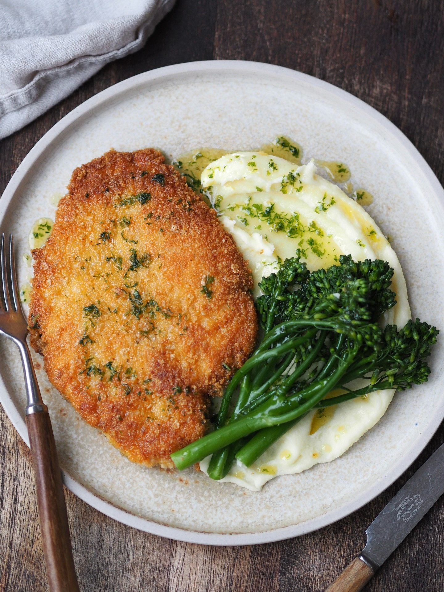 Method: 1. Place each chicken breast between a large piece of parchment paper and bash with a rolling pin to flatten it out. 2. Prep 3 plates for the breadcrumbs, flour and beaten egg. Season the flour and breadcrumbs. Coat the chicken in the flour, then the egg, then the breadcrumbs. Ensure to press the breadcrumbs into the chicken. 3. You can either pan fry the chicken in a generous amount of olive oil on a medium heat until golden on each side. Or, brush the chicken with some oil on each side and air-fry or oven bake at 180c for around 15-20 minutes turning half way. 4. For the mash, peel, dice into chunks and boil with a generous amount of salt until they easily break apart with a knife. Drain and allow to steam dry in a colander for about 5 minutes. 5. If you have a ricer, pass the potatoes through it, you can also press the potatoes through a sieve for a super smooth consistency. Then mash the potato with a masher along with the butter, milk and a good pinch of salt. Once smooth, return the pan to the hob and beat with a spatula for a few minutes for a lovely silky consistency. 6. For the garlic butter, simply melt the butter in a pan, add the garlic and allow to simmer for 1-2 minutes, add the parsley and decant into a jug, serve straight away.