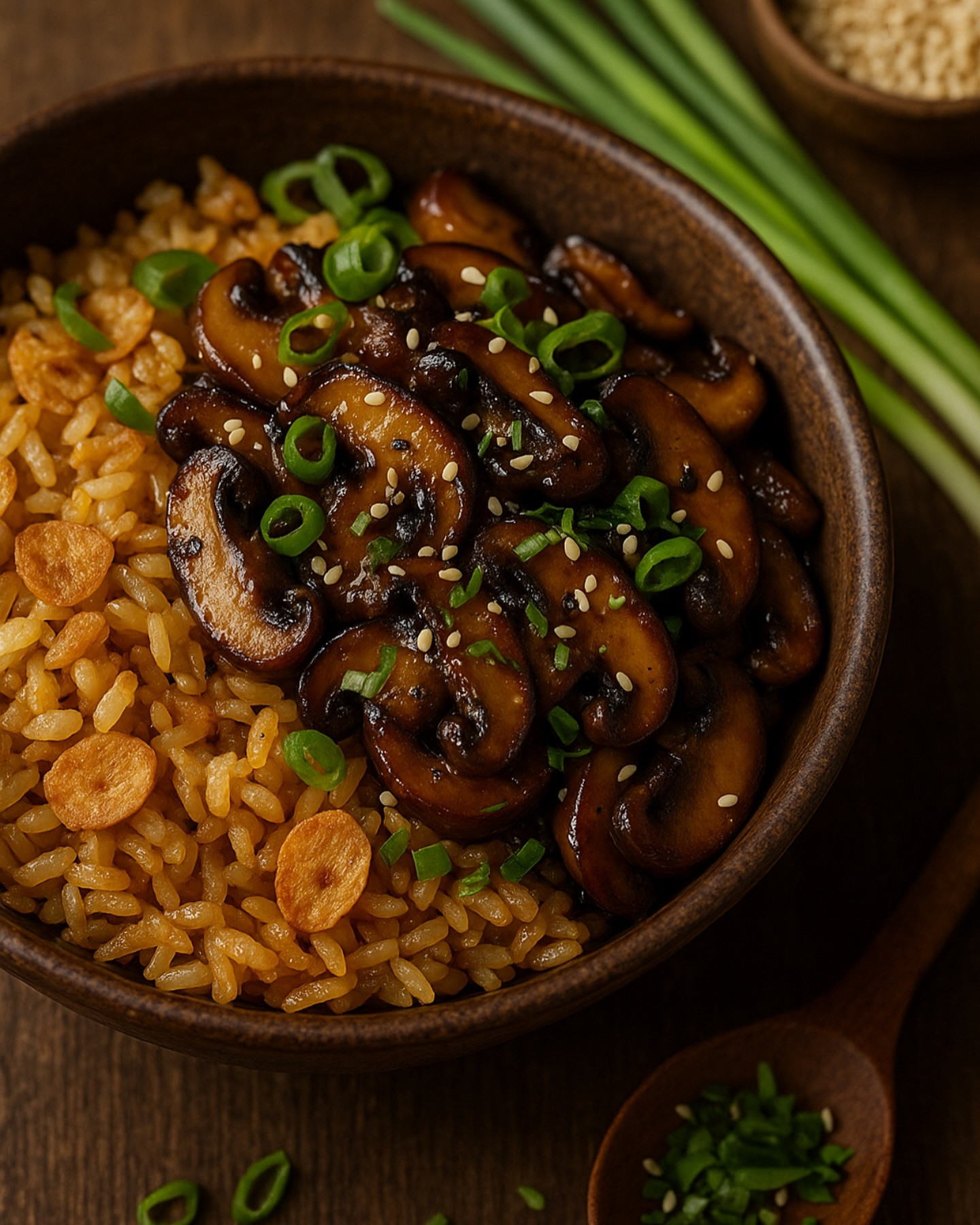 Instructions: 1. Make crispy garlic oil: Heat oil in a large nonstick pan. Add garlic slices and cook until golden and crisp (watch carefully). Remove garlic and set aside. 2. Fry the rice: In the same oil, add the cold rice. Press down with a spatula and cook undisturbed until crispy on the bottom, then stir and crisp more. Season with salt. 3. Cook the mushrooms: In a separate pan, heat sesame oil. Add mushrooms and cook until browned. Stir in soy sauce, ginger, vinegar, honey, and chili flakes. Simmer 1–2 minutes until glazed. 4. Assemble: Spoon garlic rice into bowls. Top with glazed mushrooms, scallions, sesame seeds, and crispy garlic.