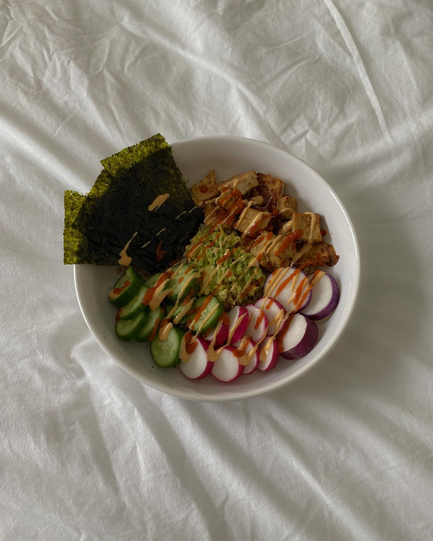 tofu poke bowl: crispy tofu (recipe below) brown rice (mixed with sesame oil and coconut aminos) cucumber radishes avocado, mashed with @traderjoes chili onion crunch, hot honey, garlic powder, salt, and pepper seaweed @gimmeseaweed sriracha bang bang sauce @tastefullysimpleinc