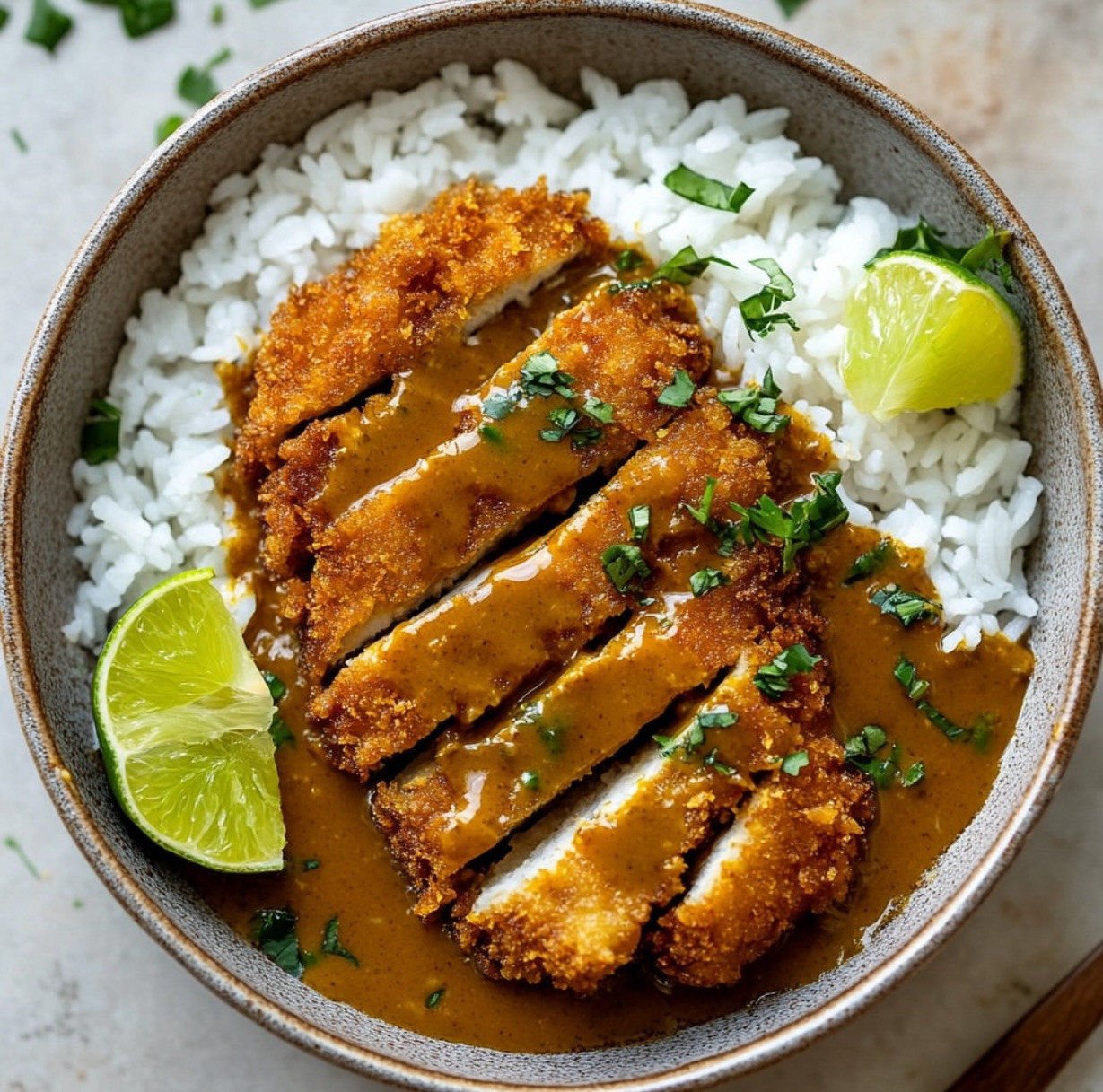 For the crispy tofu: ▢280 g extra-firm smoked tofu (I used Tofoo) ▢60 g plain flour ▢100 ml unsweetened dairy-free milk ▢1 tablespoon soy sauce ▢100 g panko breadcrumbs ▢rapeseed or sunflower oil for shallow frying For the katsu sauce: ▢2 tablespoon rapeseed or sunflower oil ▢1 onion ▢1 teaspoon ready-chopped garlic (or 1-2 garlic cloves, peeled and crushed) ▢2-3 cm fresh ginger (or 2 teaspoon ready-chopped ginger from a jar or tube) ▢1 teaspoon turmeric ▢2 tablespoon curry powder (mild, medium or hot - as you prefer) ▢1 tablespoon plain flour ▢250 ml vegetable stock ▢150 ml coconut milk ▢1 tsp soy sauce ▢1 teaspoon light brown sugar To serve (optional): ▢lime ▢sliced spring onions ▢fresh coriander ▢sesame seeds ▢rice