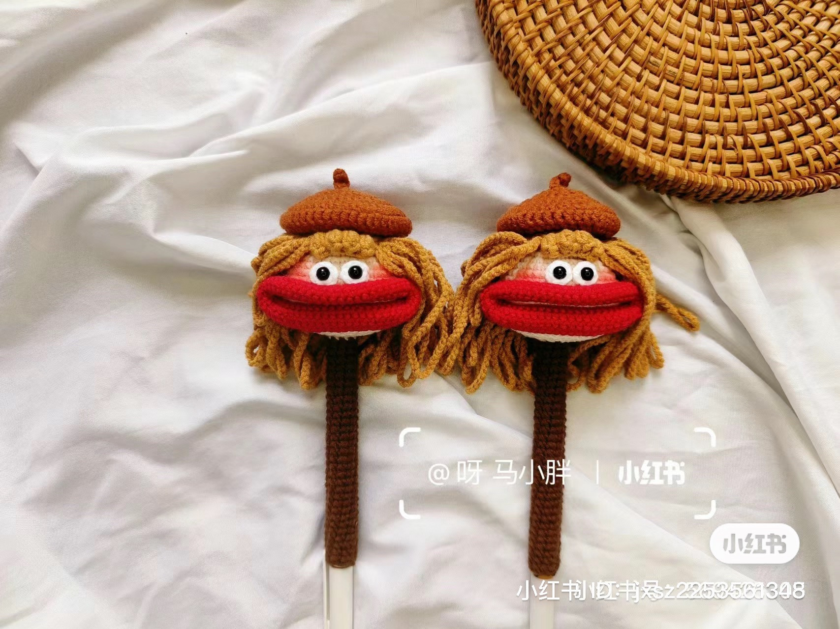 Crochet Acorn Characters with Red Lips and Yarn Hair