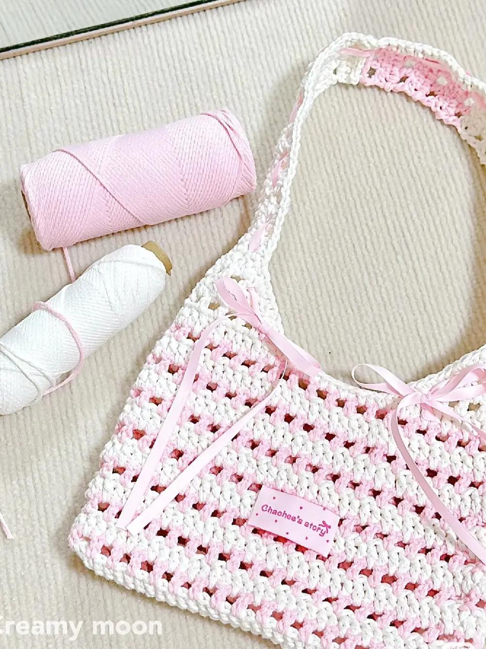 Crochet Bag with Pink and White Yarn and Ribbon Details