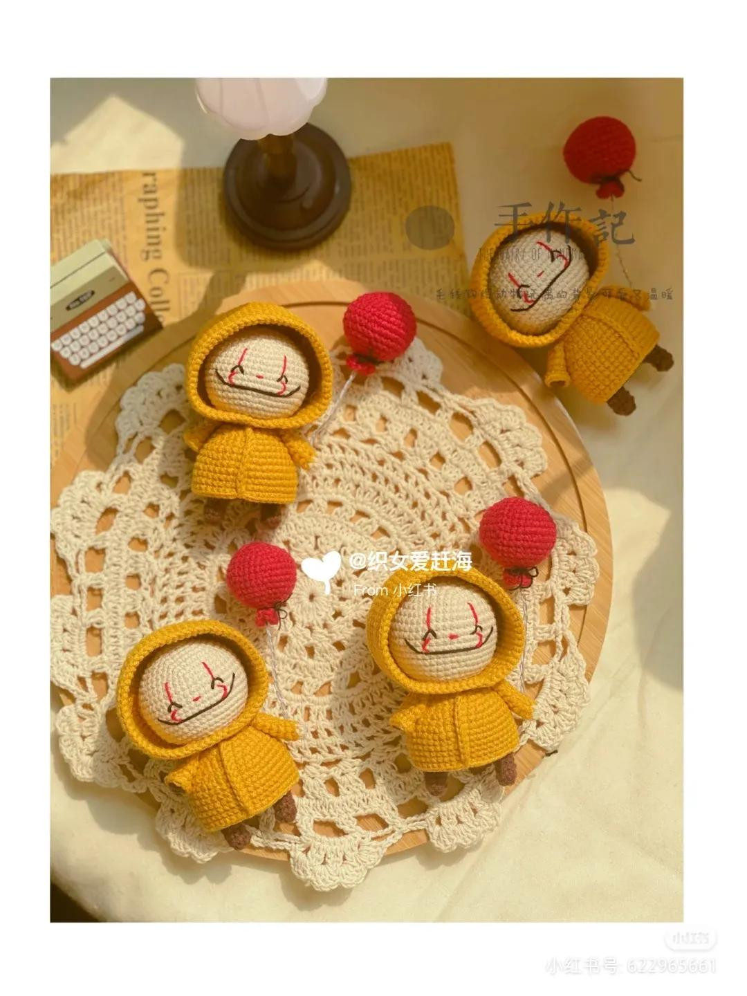 Crochet Pattern for Cute Yellow Raincoat Dolls with Red Balloons