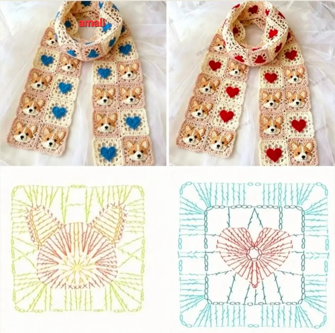Crochet Scarf with Dog and Heart Motif Patterns