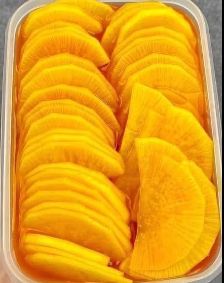 3 . Cho củ cải vào hộp nhựa hoặc hũ thủy tinh khô sạch. Chế nước giấm đã nguội vào cho ngập củ cải rồi đậy nắp kín, để ở ngoài từ 1 - 2 ngày rồi bảo quản trong ngăn mát tủ lạnh khoảng 2 ngày là có thể ăn được. Ẩn bớt Ẩn bớt