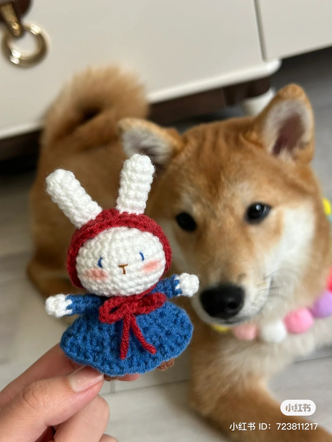 Cute Crochet Bunny Doll with Shiba Inu Background