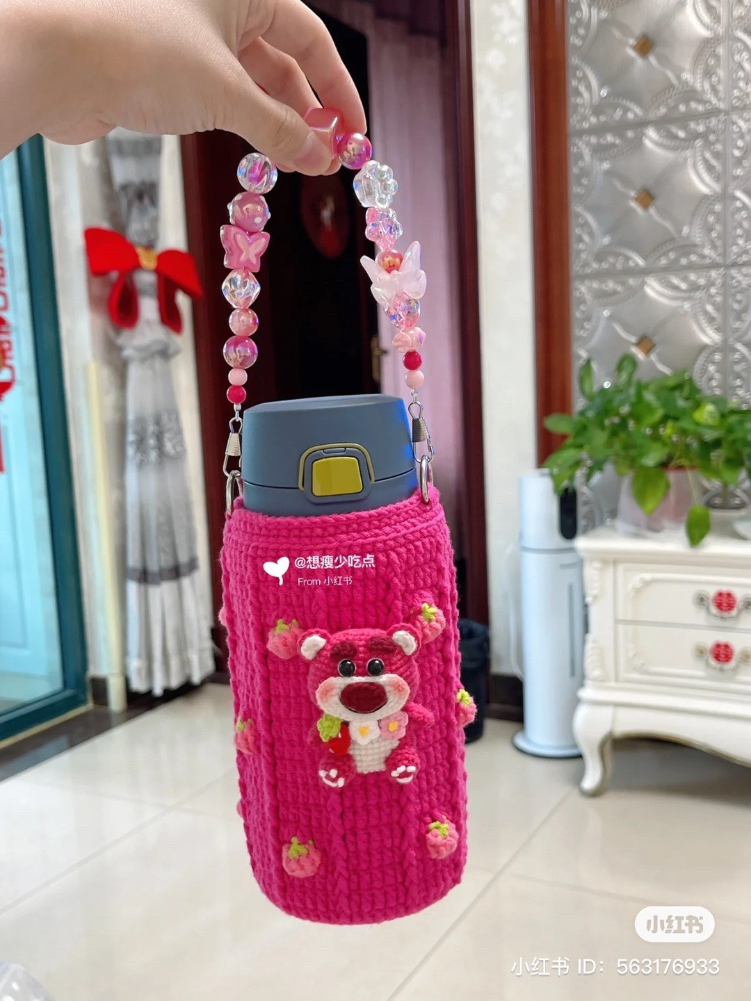Cute Pink Crochet Bottle Holder with Bear and Beaded Handle