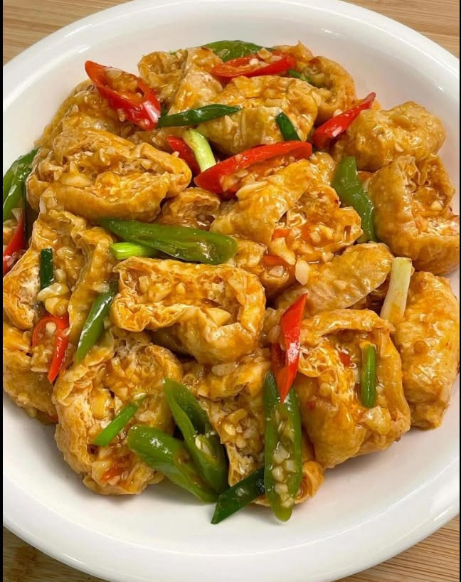 * Chuẩn bị nguyên liệu: - Đậu, bột bắp, đường, mắm, dầu hào, tương đậu * Cách chế biến: 1. Đậu phụ chiên ngập dầu để bên ngoài lớp vỏ giòn bên trong vẫn mềm ẩm rồi sau đó cắt nhỏ miếng đậu ra 2. Dầu nóng cho tỏi vào phi thơm rồi nêm thêm 1 thìa nước mắm, 1 thìa dầu hào, 1 thìa tương đậu, 1 bát nước pha bột bắp và 1/2 thìa đường, đun sôi lên 3. Cho đậu và ớt vào đảo đều lên cho thơm, đun đến khi nước tương sệt lại, áo đều vào miếng đậu thì mình tắt bếp, cho ra đĩa rồi thưởng thức thôi Ẩn bớt