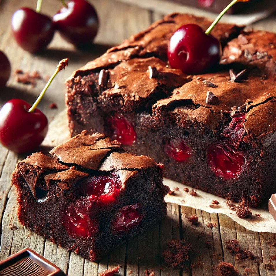 Ingredients (Makes 9–12 brownies): • ½ cup (115g) unsalted butter • 200g dark chocolate, chopped • 1 cup (200g) sugar • 2 large eggs • 1 tsp vanilla extract • ¾ cup (95g) all-purpose flour • 2 tbsp cocoa powder • ¼ tsp salt • 1 cup fresh or frozen cherries, pitted and halved
