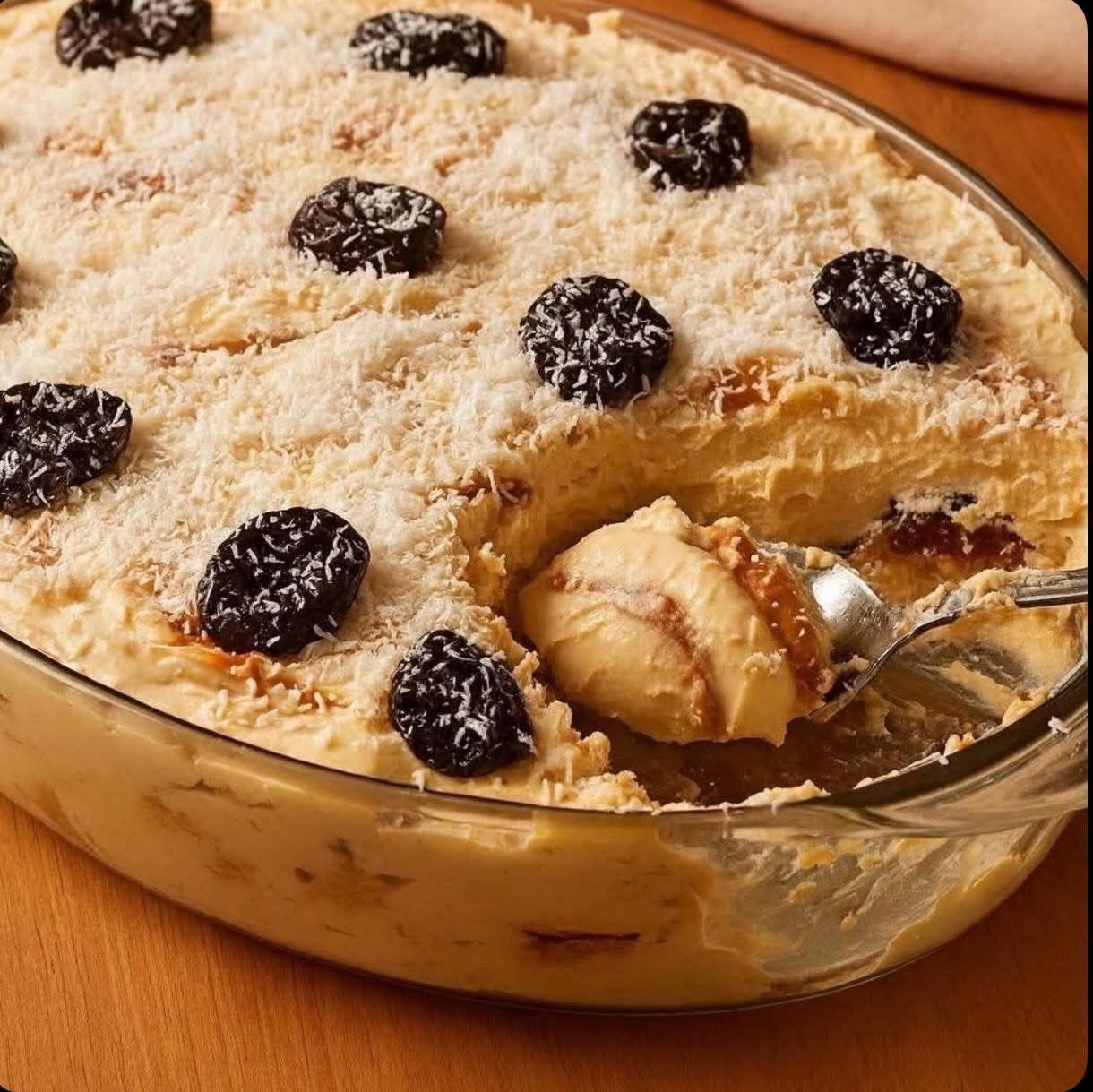 👩🍳 Modo de preparo 1. Em uma panela, coloque o leite condensado, o creme de leite, o leite de coco e o coco ralado. 2. Leve ao fogo médio, mexendo sempre, até engrossar. 3. Transfira para um recipiente, cubra com plástico-filme e deixe esfriar. 4. Bata o chantili, acrescente o doce de leite e continue batendo até ficar bem firme. 5. Para a calda, misture o açúcar com a água e leve ao fogo até ferver. 6. Acrescente as ameixas e cozinhe por cerca de 2 minutos. 7. Em uma travessa, faça uma camada de creme de doce de leite. 8. Acrescente uma camada de biscoito maisena (se quiser, umedeça rapidamente no leite). 9. Espalhe o restante do creme de doce de leite. 10. Distribua as ameixas por cima. 11. Finalize com o creme branco, bastante coco ralado e algumas ameixas para decorar.