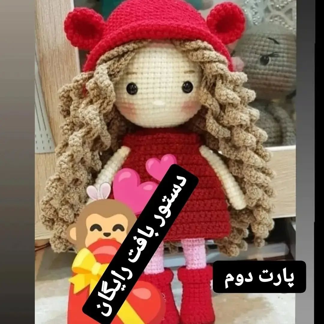 دستور بافت رایگان عروسک با کلاه قرمز و موهای فرفری
