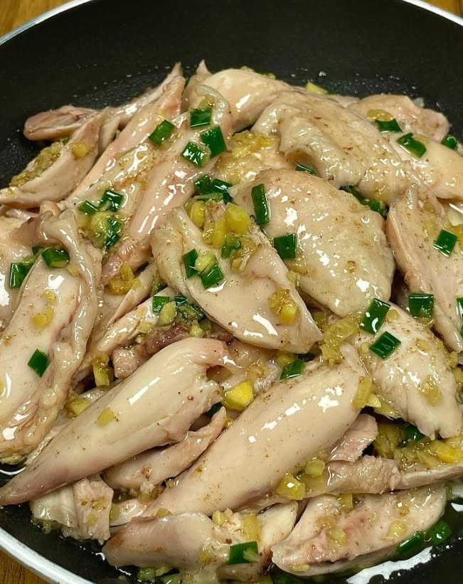 * Chuẩn bị nguyên liệu - Đùi gà, hành, gừng, muối, đường * Cách chế biến 1. Pha nước sốt: hành, gừng băm nhỏ rồi rưới dầu nóng lên cho thơm, nêm thêm chút muối, 1/2 thìa đường rồi khuấy đều lên 2. Đùi gà hấp 30 phút cùng vài lát gừng 3. Xé nhỏ đùi gà ra, trộn cùng vớ nước sốt vừa pha nữa là xong