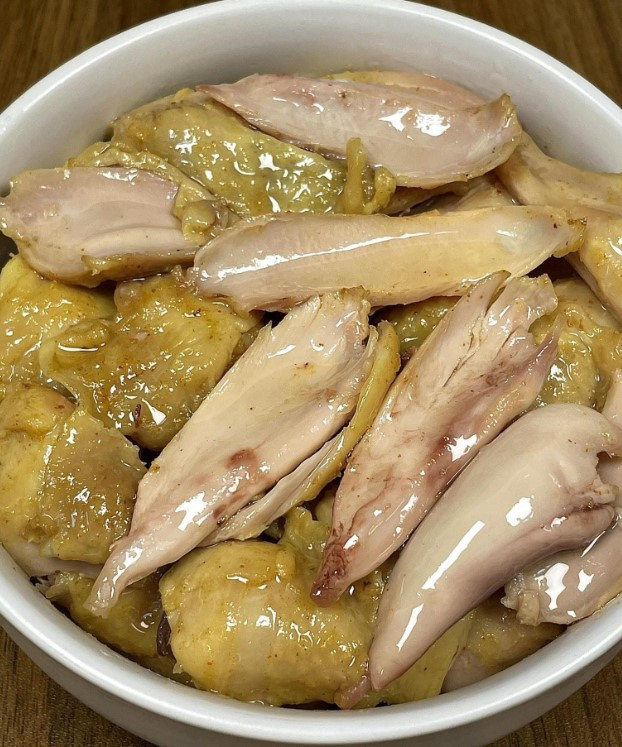 * Nguyên liệu: đùi gà, dầu ăn, 1 gói bột gà hấp muối * Cách chế biến: 1. Đùi gà mua về rửa sạch rồi luộc sơ qua khoảng 1 phút 2. Sau đó, vớt đùi gà ra để cho ráo nước hoặc có thể dùng giấy ăn để hút bớt nước đi. Ướp gà cùng với 1 thìa dầu ăn, 1 gói bột gà hấp muối trong 20 phút 3. Mang đùi gà đi hấp cách thủy khoảng 30 phút, đến khi ăn thì xé nhỏ ra là xong