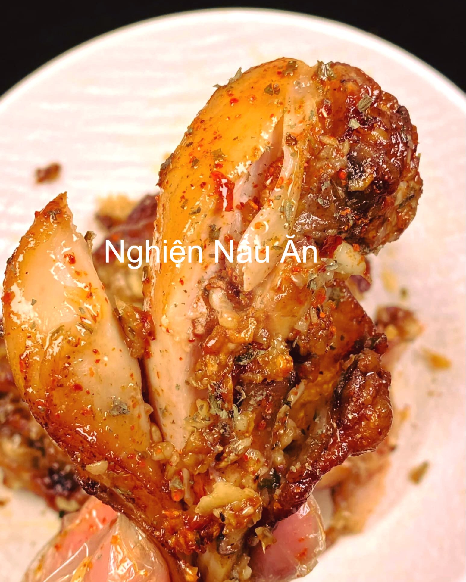 THAY ĐỔI VỊ BỮA CƠM VỚI CÁCH LÀM ĐÙI GÀ NƯỚNG BƠ TỎI SIÊU HẤP DẪN . Chuẩn bị nguyên liệu : - 4 cái đùi gà - Tỏi băm - Bơ - Lá oregano khô - Gia vị : Dầu hào , nước tương , muối , tiêu , ngũ vị hương . Cách Chế biến : 1 . Ngâm tỏi băm vào nước ấm ( khoảng 1/3 bát nước ) 2 . Đùi gà khứa ngang để ướp được thấm gia vị và khi chiên sẽ nhanh chín hơn . 3 . Vớt phần tỏi băm ra , đổ nước ngâm tỏi vào đùi gà . Thêm 1 thìa nước tương , 1 thìa dầu hào , 1 ít muối - tiêu và ngũ vị hương , trộn đều ướp trong 30-45 phút . 4 . Cho đùi gà vào nồi chiên không dầu ở 180° trong 10 phút sau đó lật lại nướng thêm 10 phút nữa . 5 . Trộn phần tỏi băm lúc nãy với bơ và 1 ít lá oregano khô . Phết lên đùi gà tiếp tục nướng thêm 10 phút nữa . Sau đó lấy ra thưởng thức . Chúc cả nhà thành công với công thức này nhé.