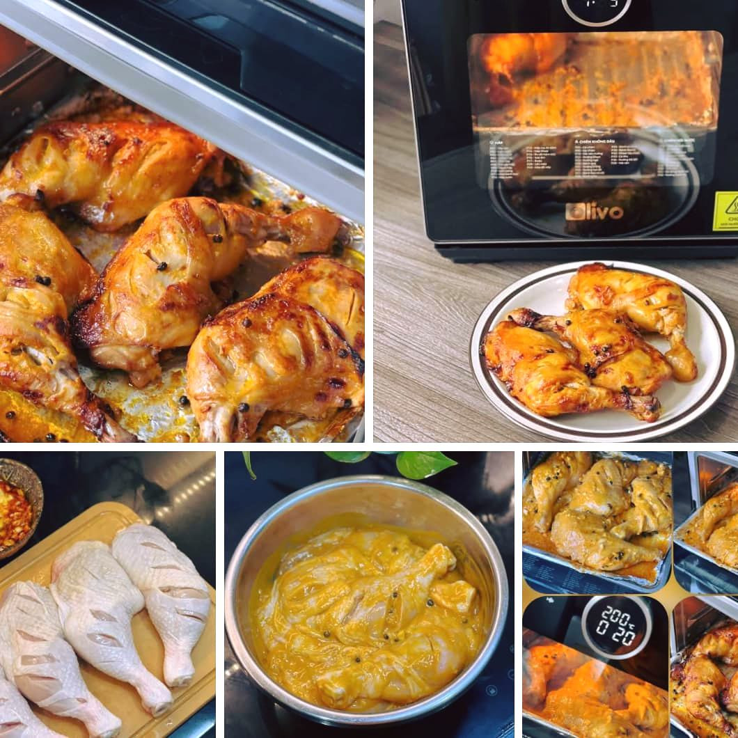 CÔNG THỨC ĐÙI GÀ NƯỚNG TIÊU AI CŨNG TẤM TẮC KHEN NGON Nguyên liệu: 3 chiếc đùi gà góc tư Gia vị ướp: - 2 thìa tương cà, 2 thìa tương ớt - 1 thìa nước mắm, 1 thìa dầu hào - 2 thìa nước tương (xì dầu) - 1 thìa đường, 2 sữa đặc - 2 thìa sốt Maiyonaise - 2 thìa dầu màu điều - 1 củ hành khô, 4-5 tép tỏi băm nhỏ - Tiêu sọ Cách làm: - Rửa sạch đùi gà với muối và gừng. Dùng dao khía lên 2 mặt đùi gà để dễ ngấm gia vị hơn. - Trộn đều gia vị ướp. Mát xa đều đùi gà với gia vị ướp. - Đặt vào giấy bạc rồi rưới hết phần nước sốt còn lại lên đùi gà. Bọc kín, ướp gà 2-3 giờ. - Nướng lần 1: 30p - 180 độ chế độ "Đùi gà nướng". - Bỏ giấy bạc, rưới tiếp sốt lên đùi gà. Nướng lần 2: 20p - 200 độ chế độ "Đùi gà nướng" (có thể lật gà để phần mặt dưới vàng đều hơn). Chúc cả nhà thành công với cách lam trên.