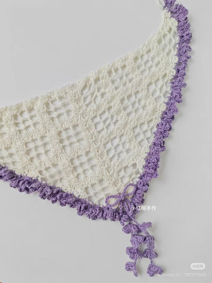 Elegant Crochet Shawl with Purple Edging and Bow Detail