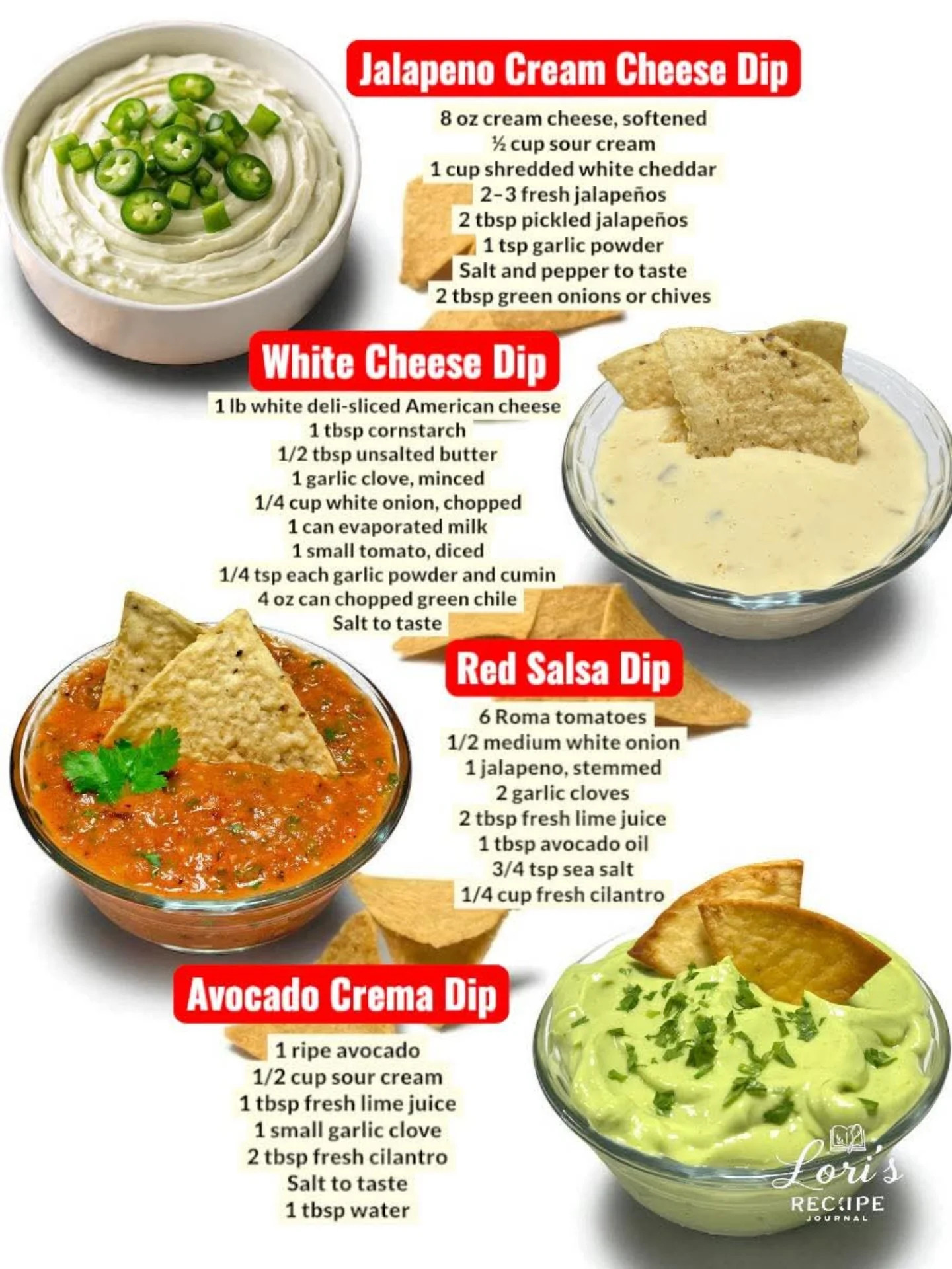Four dips, endless flavor—spicy, creamy, cheesy, and fresh in every bite!