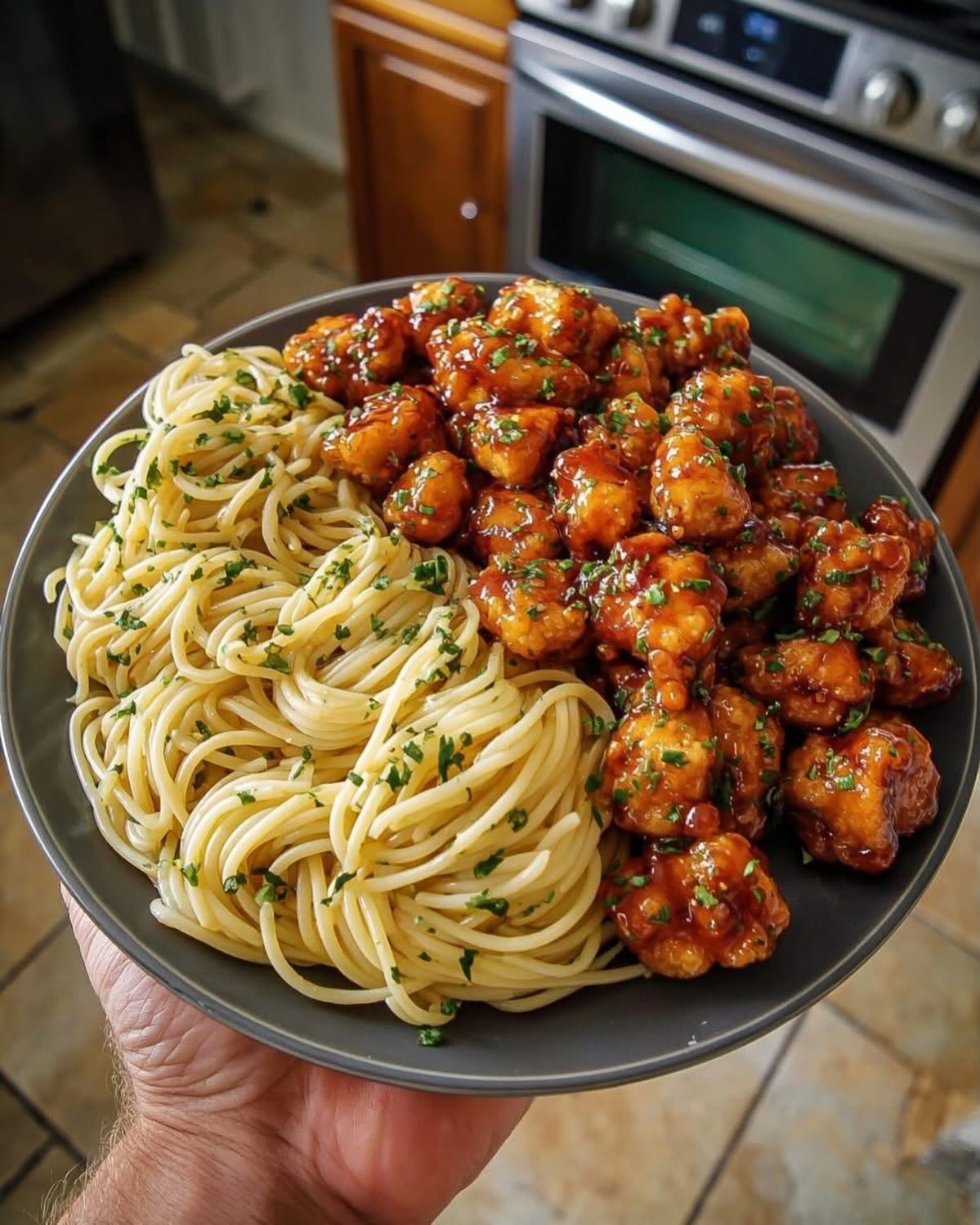 🍯 Pedaços de Frango Glaceados e molho com Espaguete na Manteiga de Ervas