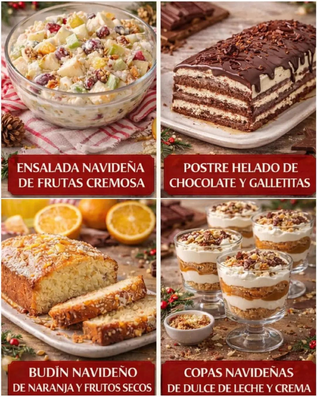 TE ENSEÑO 4 POSTRES NAVIDEÑOS 1. ENSALADA NAVIDEÑA DE FRUTAS CREMOSA Un clásico infaltable en la mesa navideña, fresca y liviana. Ingredientes (6–8 porciones) 3 manzanas en cubos 1 taza de piña en cubos 1 taza de uvas cortadas a la mitad ½ taza de nuez picada ½ taza de pasas 1 taza de crema de leche ½ taza de leche condensada (o a gusto) Jugo de ½ limón Preparación Mezclá las manzanas con el jugo de limón. Agregá el resto de las frutas, nuez y pasas. Incorporá la crema y la leche condensada. Mezclá suavemente y llevá a la heladera al menos 1 hora antes de servir. 2. POSTRE HELADO DE CHOCOLATE Y GALLETITAS Fácil, sin horno y súper tentador. Ingredientes 2 paquetes de galletitas de chocolate 500 ml de crema de leche 1 lata de leche condensada (397 g) 200 g de chocolate semiamargo 2 cucharadas de manteca Preparación Derretí el chocolate con la manteca y dejá entibiar. Batí la crema a medio punto y mezclá con la leche condensada. Sumá el chocolate derretido. En un molde armá capas de galletitas y crema. Llevá al freezer mínimo 4 horas. 3. BUDÍN NAVIDEÑO DE NARANJA Y FRUTOS SECOS Húmedo, perfumado y muy rendidor. Ingredientes 3 huevos 200 g de azúcar 120 ml de aceite 200 ml de jugo de naranja Ralladura de 1 naranja 240 g de harina común 12 g de polvo de hornear ½ taza de nueces o almendras picadas Preparación Batí huevos y azúcar hasta espumar. Agregá aceite, jugo y ralladura. Incorporá harina y polvo de hornear. Sumá los frutos secos. Horneá a 180 °C por 40–45 minutos. 4. COPAS NAVIDEÑAS DE DULCE DE LECHE Y CREMA Elegantes, rápidas y sin complicaciones. Ingredientes (6 copas) 400 g de dulce de leche 400 ml de crema de leche 1 cucharadita de vainilla Galletitas trituradas Chocolate rallado o nuez para decorar Preparación Batí la crema con la vainilla hasta punto suave. En copas armá capas de galletitas, dulce de leche y crema. Repetí y decorá a gusto. Refrigerá hasta el momento de servir. #fblifestyle #Postres #navidad