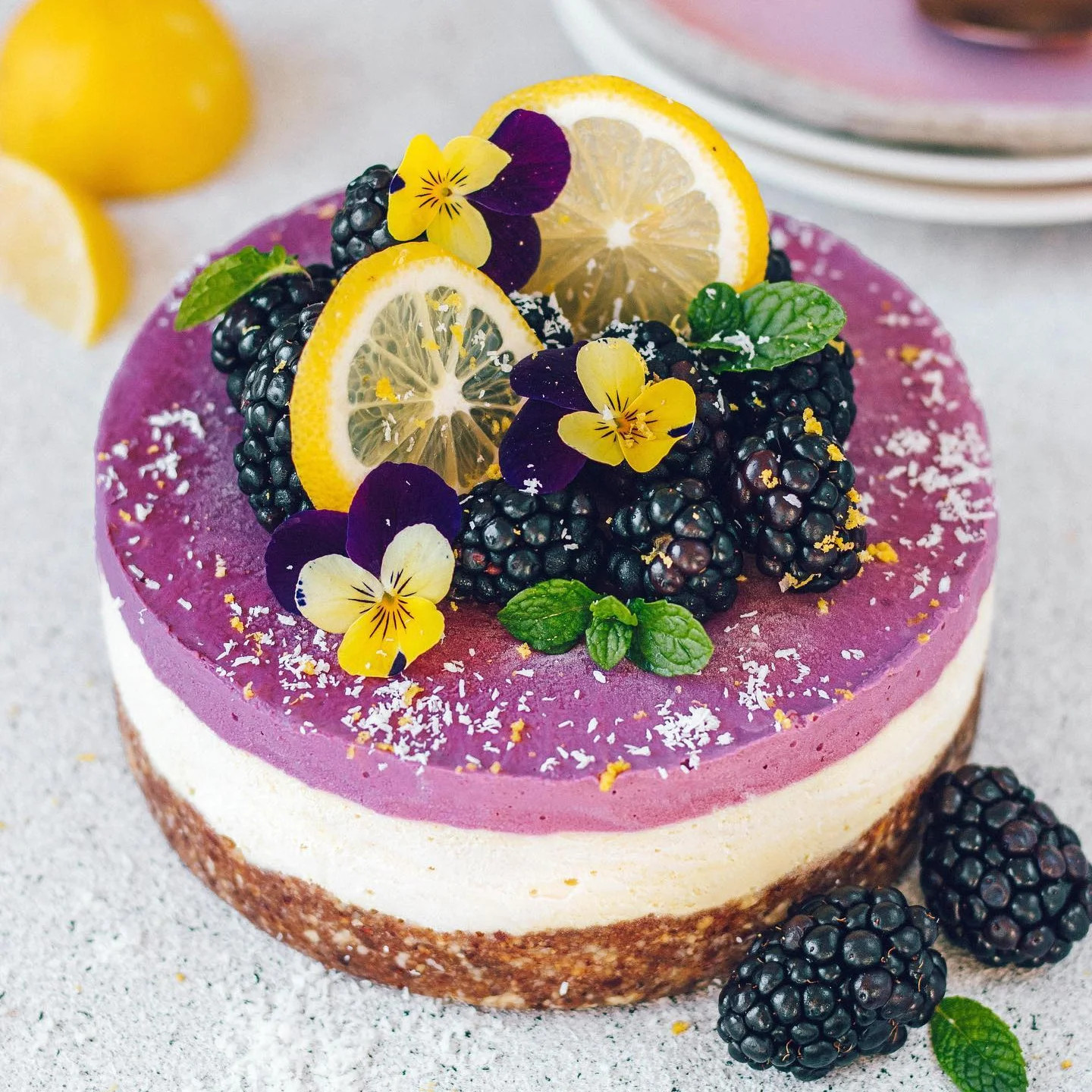 No-bake Blackberry Lemon Cheesecake 🍋💜 If you ever feel like making a fruity, creamy and delicious dessert, look no further 🤭 The flavour combinations are endless but I decided to use the blackberries that I had in the fridge for this one! Full recipe is below, enjoy 👌🏼 ⠀⠀⠀⠀⠀⠀⠀⠀⠀⠀⠀⠀ Base 1 cup almonds (any nuts work) 1/2 cup shredded coconut 1/4 tsp sea salt 1 cup pitted dates ⠀⠀⠀⠀⠀⠀⠀⠀⠀⠀⠀⠀ Filling 1.5 cups raw cashews, soaked overnight & drained (or, a little hack is to soak it in boiling water for 10-15 mins instead!) 1/2 cup full fat coconut cream 1/2 cup maple syrup 1/4 cup lemon juice Zest of 2 lemons 1 tsp vanilla extract 1/2 cup blackberries (if frozen, thaw first) ⠀⠀⠀⠀⠀⠀⠀⠀⠀⠀⠀⠀ Method 1. Add the almonds, coconut and salt into a blender or food processor and blitz well until it becomes a fine crumb. Add in the dates and continue to process until well combined. It should stick when pressed together, if not then add in 1 tbsp of water and blend again. Press into a lined cake tin and pop into the freezer. 2. For the filling, combine all the ingredients minus the blackberries into a blender and blend until completely smooth. Take out a little over half of the mixture and pour on top of the base. Place into the freezer to set slightly. 3. With the remaining mixture, add in the blackberries and blend until smooth. Pour on top of the first layer and freeze until completely set. 4. Decorate with your desired toppings and serve. You can then place it into the fridge for up to 1 week or freeze it for 1 month (thaw before serving). Enjoy!