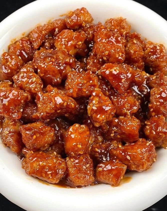 🔥 Cách làm: 1. Áo thịt gà đã ướp với một lớp bột khô (bột năng hoặc bột mì). 2. Chiên ngập dầu đến khi vàng giòn thì vớt ra để ráo dầu. 3. Đun sôi hỗn hợp nước sốt cho sánh lại. 4. Đổ thịt gà đã chiên vào đảo đều, sốt áo đều miếng gà. 5. Rắc thêm mè rang (vừng trắng) lên trên.
