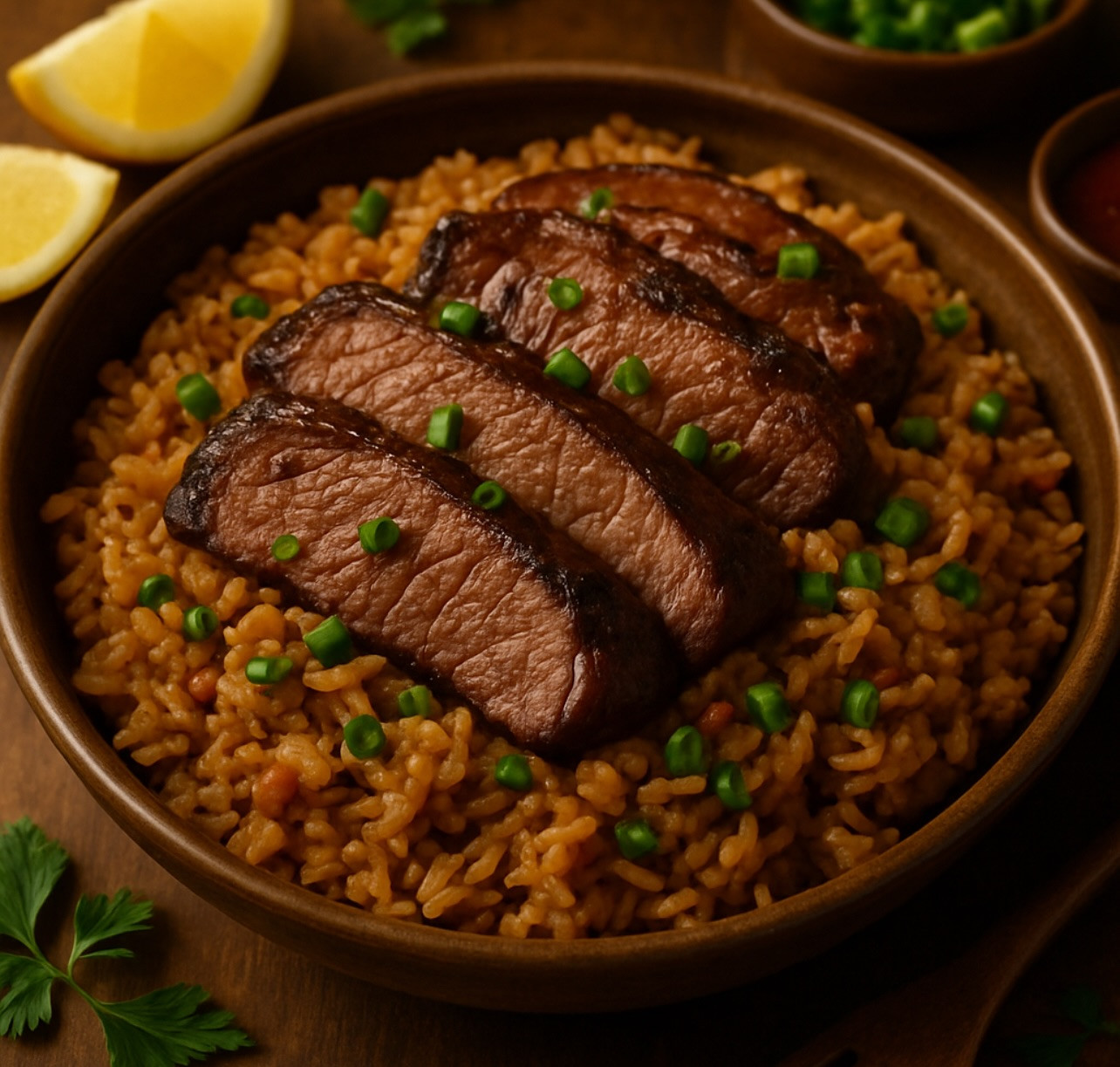 • 1 lb (450 g) sirloin or flank steak, thinly sliced • 1 cup long-grain rice • 2 cups beef broth • 3 Tbsp butter • 4 garlic cloves, minced • 1 small onion, finely chopped • 1 tsp paprika • Salt & pepper • 2 Tbsp chopped parsley • Optional: red pepper flakes or a squeeze of lemon juice
