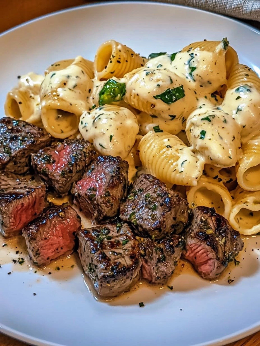 1️⃣ Cook shell pasta according to package instructions, drain, and set aside. 2️⃣ Season cubed steak with salt and pepper. In a large skillet over medium-high heat, melt butter and add minced garlic. 3️⃣ Add steak bites to the skillet and sear until browned on all sides and cooked to desired doneness. Remove from pan and set aside. 4️⃣ In the same skillet, reduce heat to medium and add milk, ranch dressing, cream cheese, minced jalapeño, and onion powder. 5️⃣ Stir continuously until cream cheese is fully melted, then add shredded cheddar and continue stirring until sauce is smooth and creamy. 6️⃣ Add cooked pasta shells to the sauce and toss until evenly coated. 7️⃣ Serve pasta topped with steak bites and garnish with additional chopped jalapeño if desired.