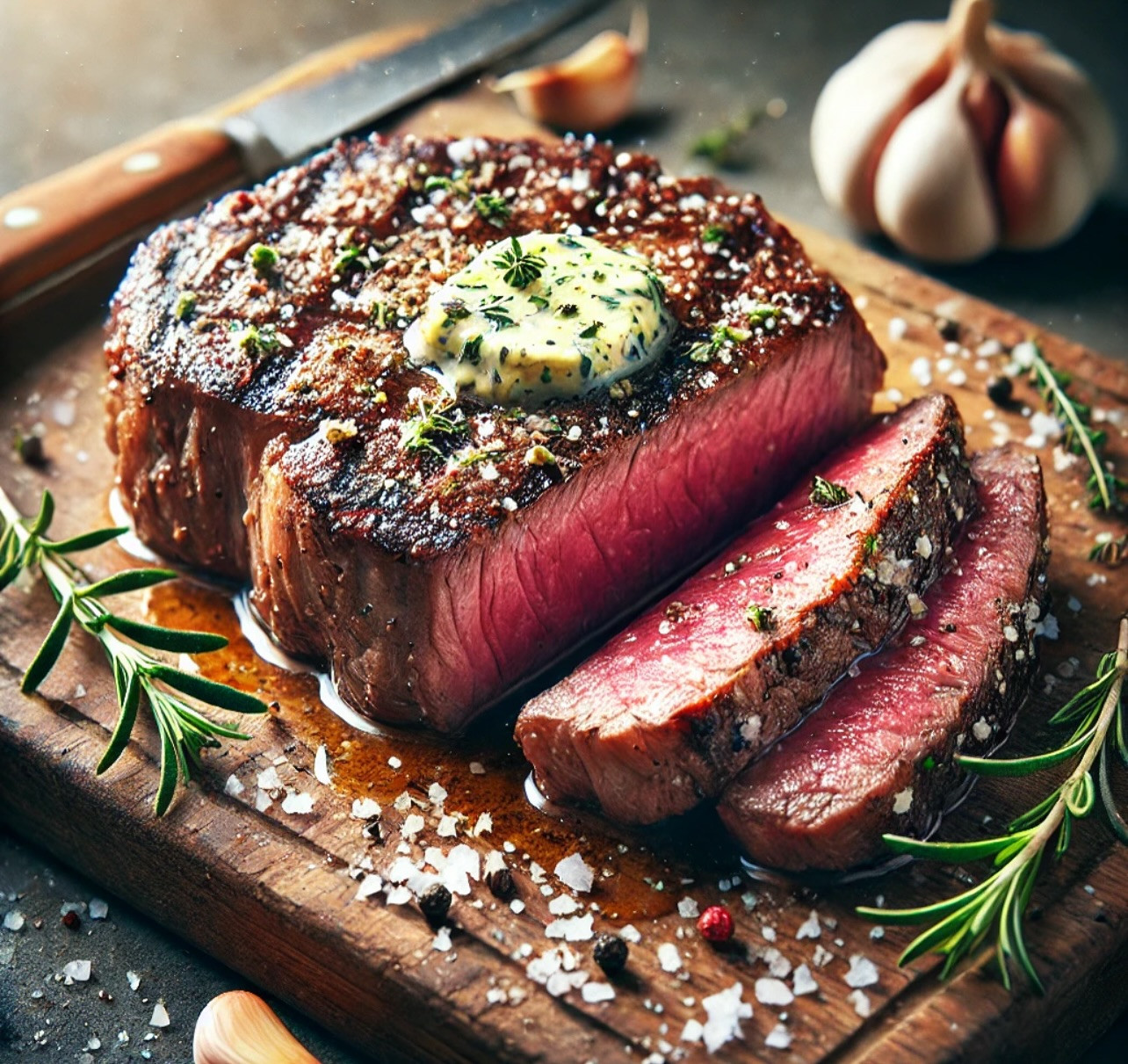Instructions: 1. Take steak out of fridge 30 minutes before cooking. Pat dry. Season generously with salt & pepper. 2. Heat oil in a cast iron skillet over high heat until smoking. 3. Sear steak 2–3 min per side (for medium-rare), pressing gently for crust. 4. Lower heat, add butter, garlic, and herbs. Baste steak with melted butter for 1–2 more minutes. 5. Rest steak 5–7 minutes before slicing. Spoon butter over top to serve.
