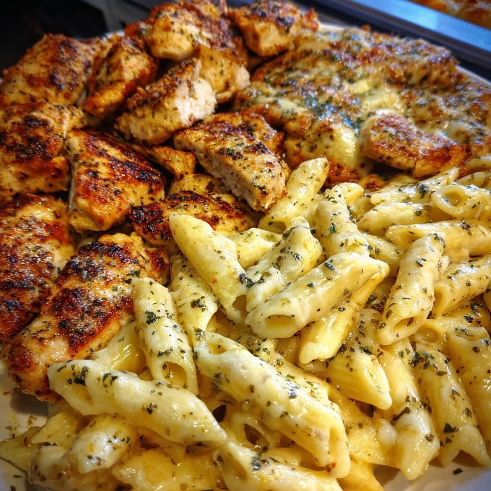 1½ Ibs boneless, skinless chicken breasts, cut into bite-sized pieces 12 oz penne pasta 1 tbsp olive oil 4 tosp unsalted butter, divided 4 cloves garlic, minced 1½ tsp Italian seasoning ½ tsp Cajun seasoning (optional, for a subtle kick) Salt and freshly ground black pepper, to taste ½ cup shredded mozzarella cheese (for melting over chicken) ½ cup grated Parmesan cheese (for melting over chicken) 1½ cups heavy cream ¾ cup low-sodium chicken broth ¾ cup shredded mozzarella cheese (for the sauce) ¾ cup grated Parmesan cheese (for the sauce) 2 oz cream cheese, softened Chopped parsley or dried parsley, for garnish