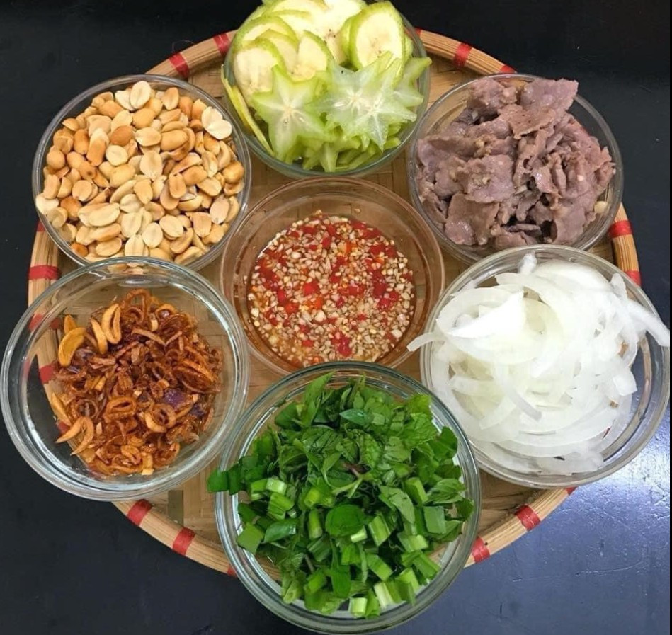 Gỏi bò bóp thấu Nguyên liệu: 300gr thịt thăn bò 2 quả chuối 2 quả khế 1/2 củ hành tây 1/2 quả dứa(nếu có) Vừng rang Hành khô Tỏi chiên vàng Lạc Rau thơm: húng lìu (húng chó),rau mùi răng cưa(rau mùi tàu),rau mùi ta Gia vị: nước mắm,đường,chanh,tỏi,hành củ ớt,hạt tiêu,hạt nêm,muối,giấm... Cách làm: Thịt bò thái mỏng ướp với: 2 thìa cà phê tỏi băm,1 thìa cà phê bột nêm,1/2 thìa cà phê hạt tiêu,1 thìa canh dầu ăn,trộn đều ướp trong 10-15p. Lạc rang chín giã dập Hành củ phi vàng Tỏi xắt lát mỏng vừa chiên vàng giòn nhưng ko đc để cháy sẽ bị đắng Hành tây bỏ lõi xắt mỏng ngâm với nước đá cho hành bớt cay và giòn. Chuối xanh bỏ gân,lột vỏ cắt mỏng ngâm nước muối thêm chút giấm cho bớt chát và đỡ thâm. Khế bỏ gân cắt mỏng ngâm trong nước pha chút giấm và muối cho đỡ thâm. Dứa xắt mỏng(nếu có) Các loại rau thơm rửa sạch cắt khúc nhỏ vừa ăn Pha nước trộn gỏi: 2 thìa canh đường+1 thìa canh nước cốt chanh+2 thìa canh nước mắm hoà cho tan đường,thêm tỏi ớt băm nhuyễn. Thịt bò sau khi ướp xong ngấm gia vị,bắc chảo lên bếp,đợi chảo nóng cho thịt bò vào xào chín tới,không cần cho thêm dầu ăn vì trước đó đã ướp thịt với dầu ăn,cách ướp dầu trước sẽ làm cho thịt mềm hơn khi xào.Thịt chín đổ ra bát cho nguội. Vớt khế,chuối,hành tây ra cho ráo nước (cần thiết dùng tay vắt bớt nước ở khế và chuối,hành tây ko cần vắt nước vì ngâm nước đá rất giòn và dễ gẫy),trộn vào một thìa canh nước trộn gỏi,trộn cho thật đều. Trộn một thìa canh nước trộn gỏi vào bát thịt bò đợi cho ngấm. Sau đó đổ bát thịt bò vào bát có chuối,khế,hành tây,dứa... trộn thật đều,nêm nếm cho vừa ăn,nhạt cho thêm nước trộn gỏi,muốn ăn cay hơn nữa thì cho thêm ớt.Cuối cùng cho rau thơm vào trộn đều và rắc lạc,vừng,hành khô,tỏi chiên giòn lên trên là xong. P/s: cách làm nước mắm chua ngọt cho bạn nào thích tỏi nổi lên: 2 thìa canh nước mắm,hai thìa canh đường,một thìa canh nước cốt chanh,2 thìa canh nước đun sôi để nguội,hoà cho tan đường,thêm tỏi băm (muốn tỏi nổi các bạn đừng đập dập tỏi mà băm nhỏ,nhưng ai quen tay kể cả đập dập băm nhỏ vẫn nổi,bạn nào chưa thành công cách đơn giản nhất chỉ băm nhỏ không đập dập nhé),thêm ớt băm