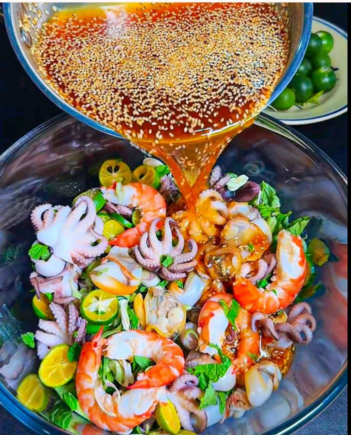 BÍ QUYẾT LÀM NÊN HƯƠNG VỊ HẢI SẢN KHÔNG THỂ THIẾU NƯỚC SỐT VỊ CHUA NGỌT HÀI HOÀ ĐẬM VỊ Khi nhắc đến gỏi Thái hải sản hấp dẫn thì không thể thiếu “linh hồn” của nước sốt vị chua ngọt vừa miệng, cay nồng nhẹ, thêm mè rang thơm bùi khiến hải sản giòn ngọt càng nổi bật. Nguyên liệu làm nước sốt - ½ chén (120ml) nước cốt tắc - ¼ chén (60ml) giấm trắng - ¼ chén (60ml) nước mắm ngon - 6–7 muỗng canh đường cát trắng (~100g) - 3–4 muỗng canh mè trắng rang chín - 3–4 muỗng canh tương ớt (tùy khẩu vị) Cách nấu nước sốt - Cho đường, nước mắm và tương ớt vào nồi, đun nhỏ lửa cho tan hoàn toàn. - Thêm giấm và nước cốt tắc, nấu đến khi hỗn hợp sôi lại và hơi sánh nhẹ. - Cho mè rang vào, khuấy đều rồi tắt bếp. - Để nguội hoàn toàn, dùng để trộn hải sản hoặc gỏi. Cách trộn gỏi hải sản - Luộc chín tôm, sò, ốc, bạch tuộc… rồi vớt ra để ráo hoặc ngâm nước đá cho giòn. - Cho hải sản vào tô lớn, rưới nước sốt đã nấu, trộn đều. - Thêm rau thơm, sả cắt lát mỏng, tắc cắt lát, trộn nhẹ tay. - Dọn ra dĩa, ăn kèm bánh phồng tôm hoặc bánh tráng nướng. Thành phẩm - Hải sản giòn ngọt, thấm vị chua cay mặn ngọt hài hòa. - Nước sốt đỏ cam đẹp mắt, thơm bùi mè rang. - Ăn kèm bánh phồng tôm giòn rụm càng thêm hấp dẫn. Vậy là đã xong món gỏi trộn hải sản thơm ngon chỉ trong vòng vài bước nhỏ, chúc cả nhà thành công với món này nhé, đừng quen làm và khoe thành quả của nhà với mình nha.