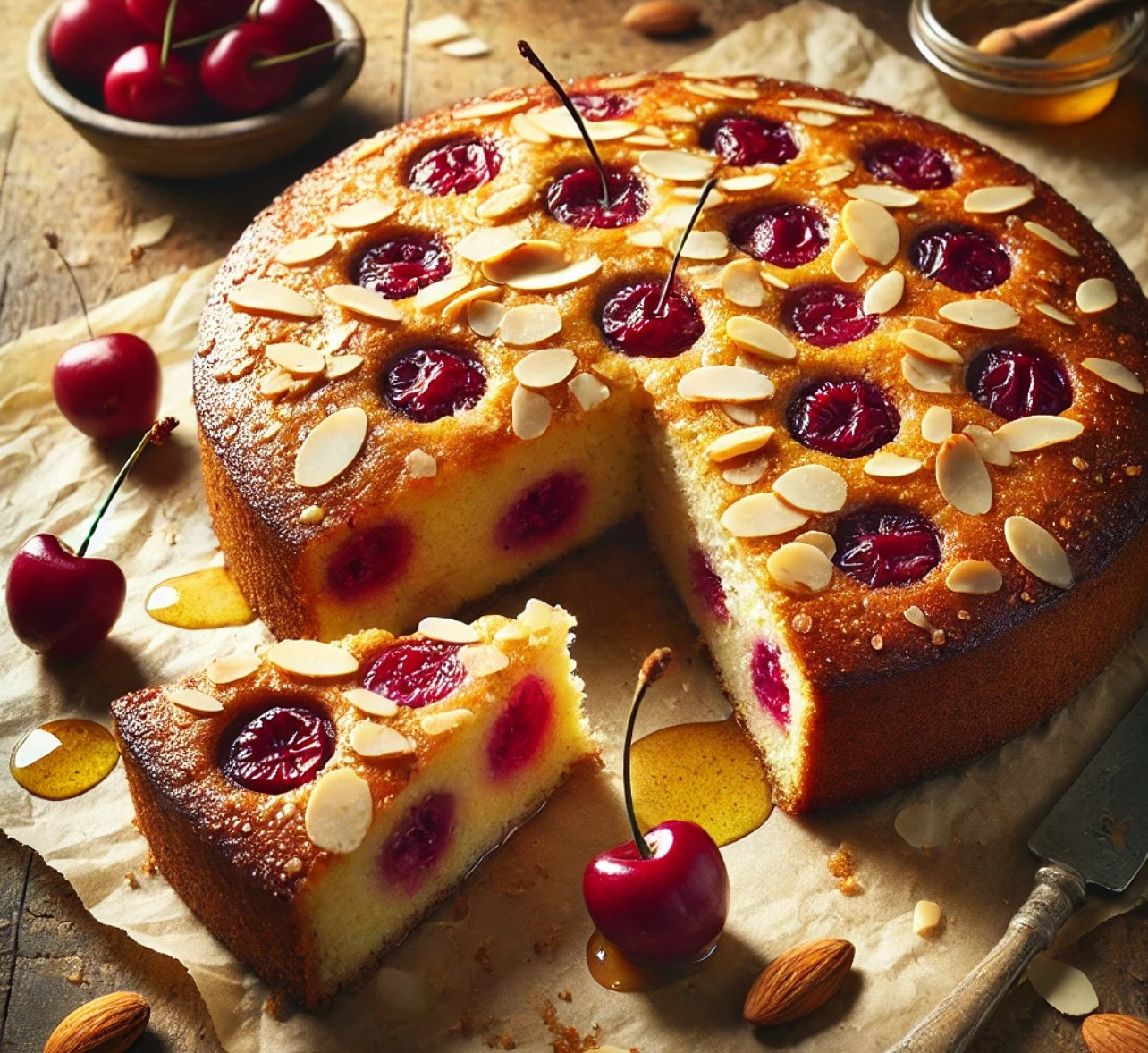 Instructions: 1. Preheat oven to 350°F (175°C). Grease and line a round cake pan. 2. Mix flour, almond flour, baking powder, and salt. 3. Beat butter, sugar, and honey until creamy. Add eggs one by one, then yogurt, vanilla, and lemon zest. 4. Fold in dry ingredients gently. Spread batter in pan, pressing cherries on top. 5. Sprinkle sliced almonds, bake 40–45 min until golden and set. 6. Drizzle with honey before serving.
